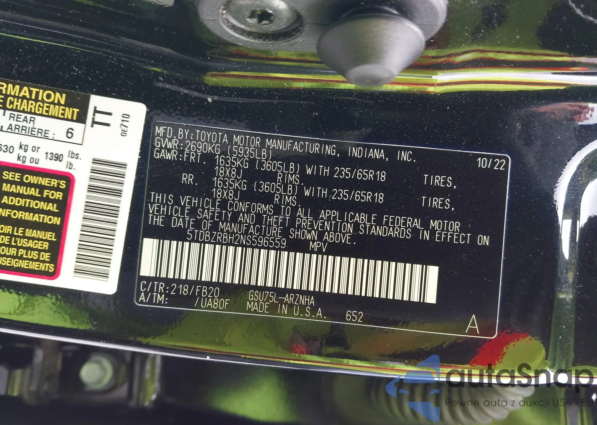 • VIN 5TDBZRBH2NS596559