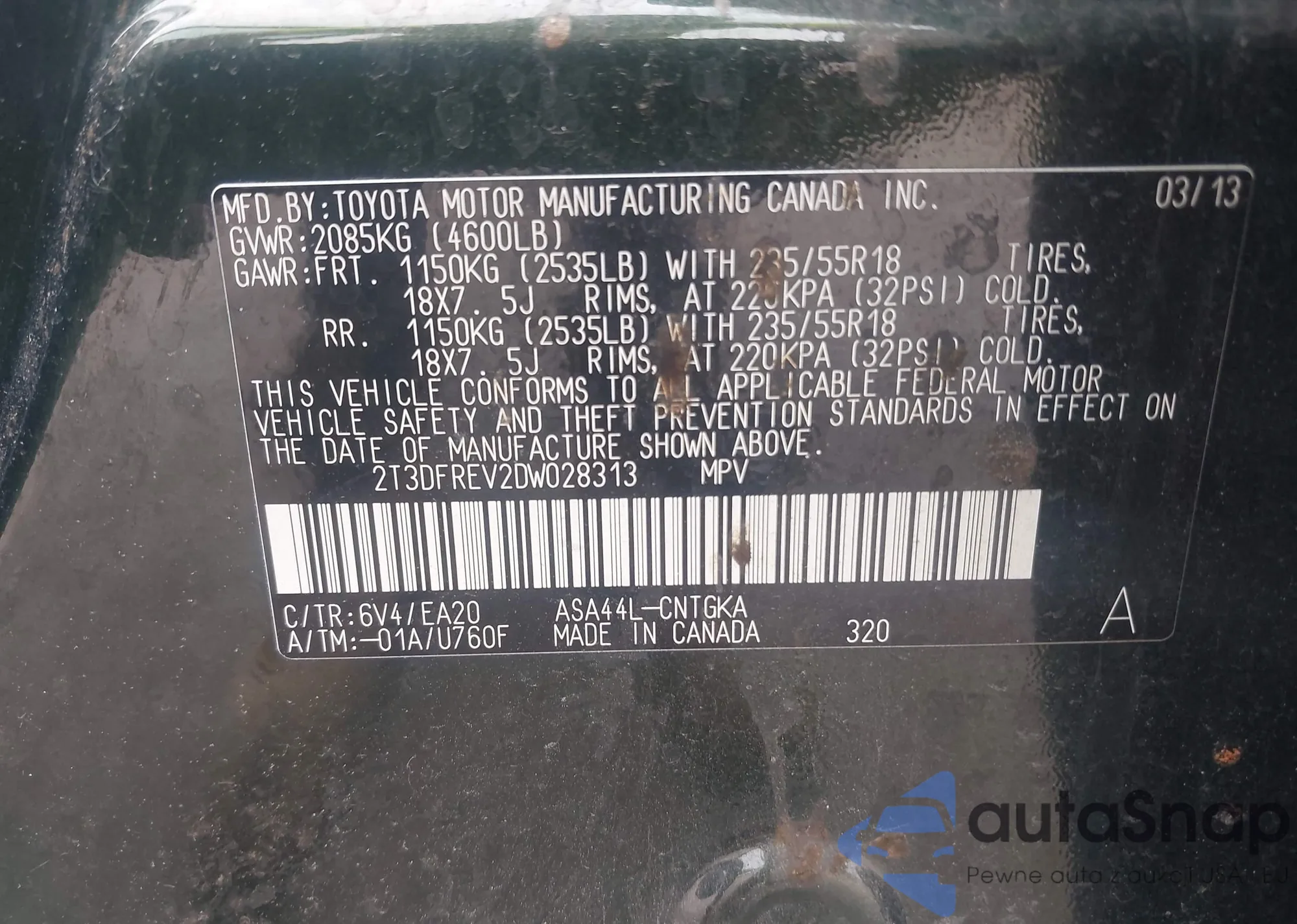 LOT: 42885982 VIN: 2T3DFREV2DW028313