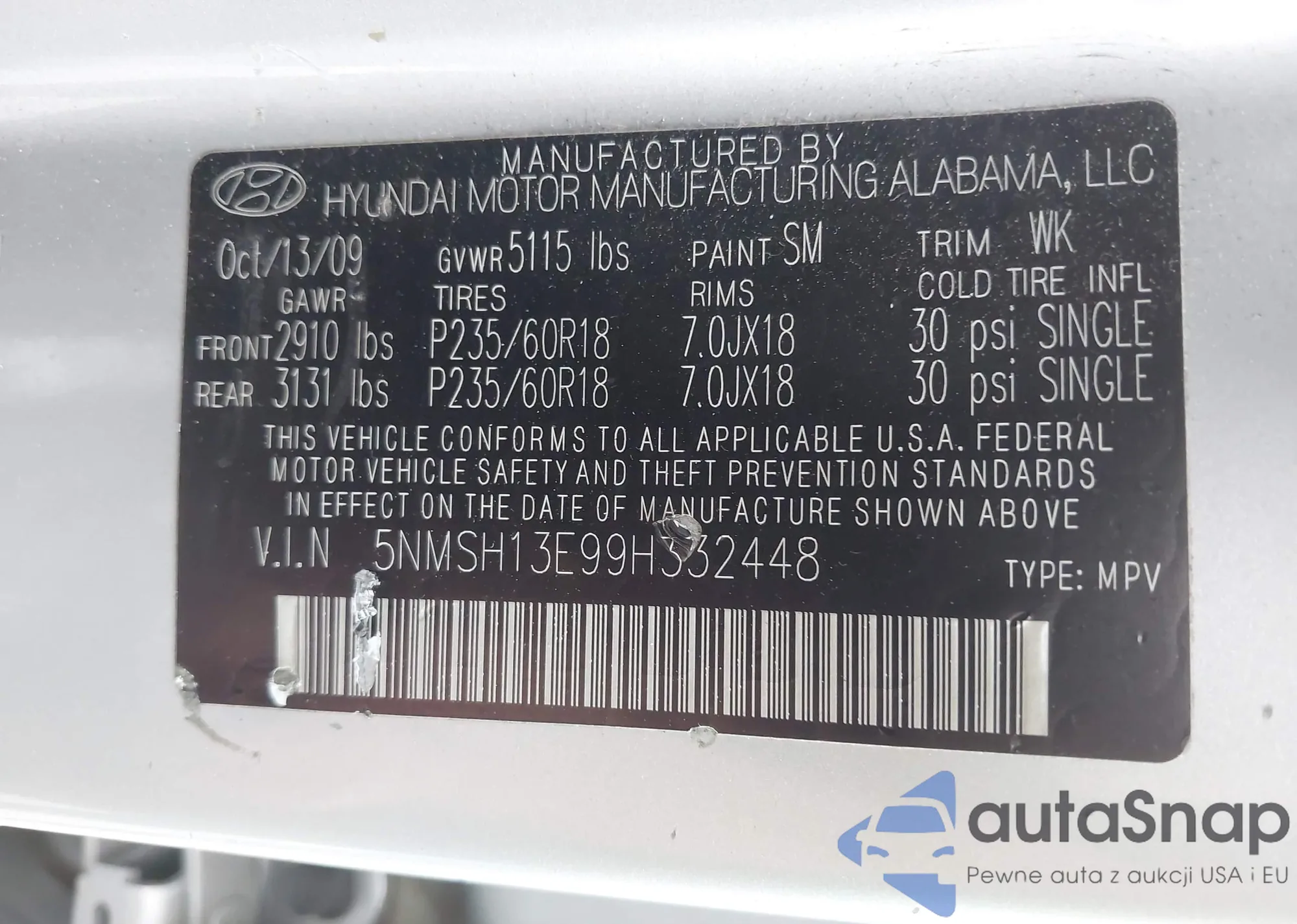 • VIN 5NMSH13E99H332448