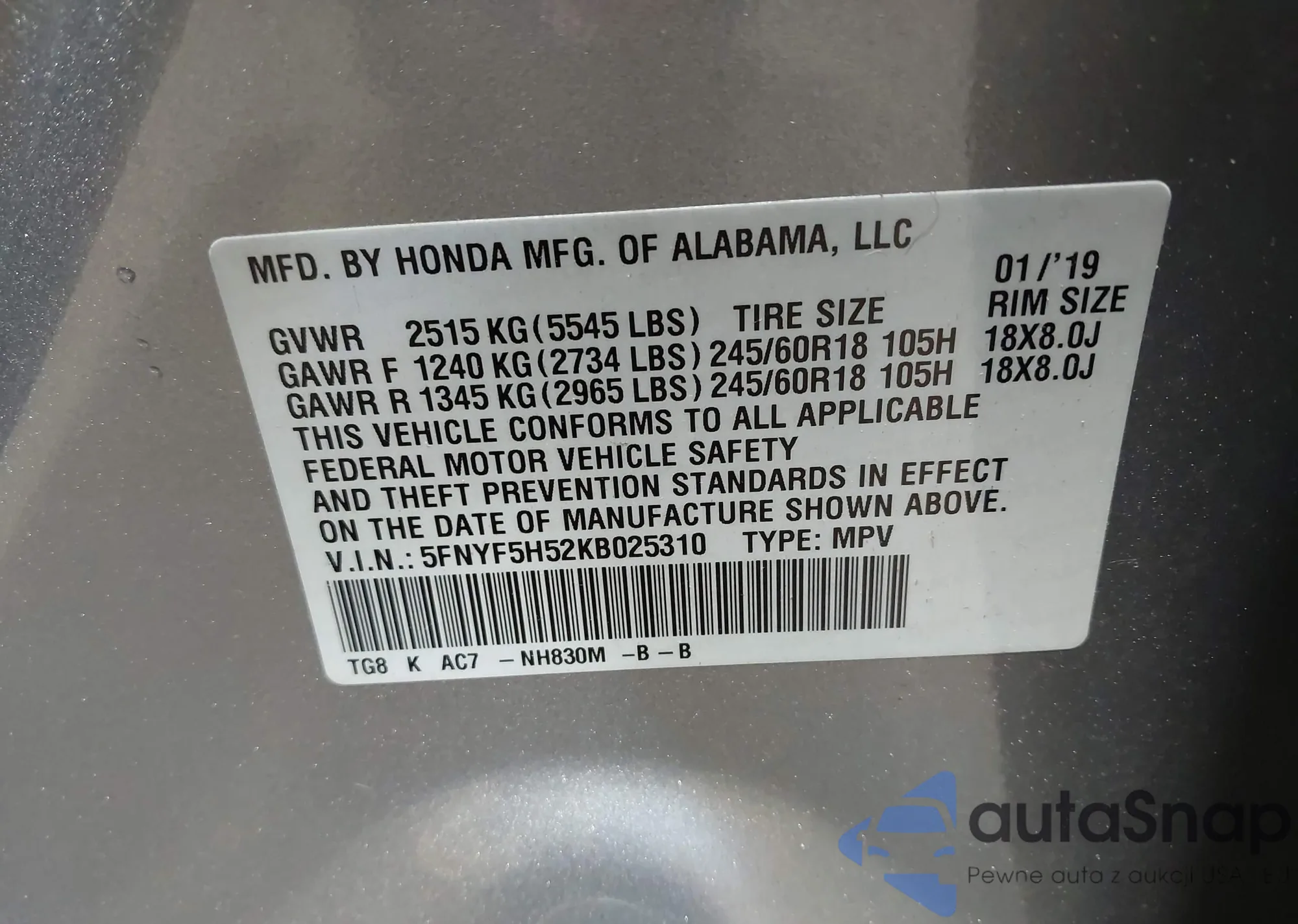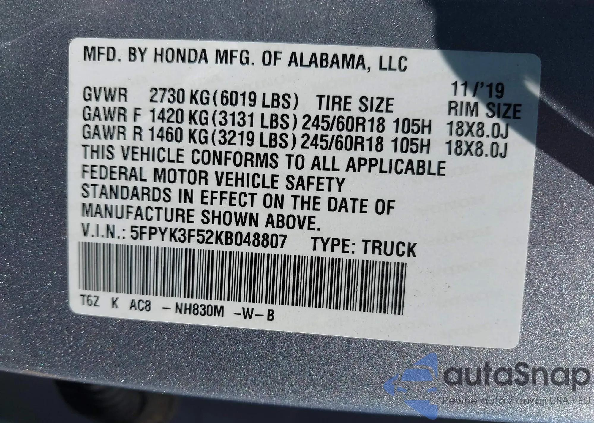 • VIN 5FPYK3F52KB048807