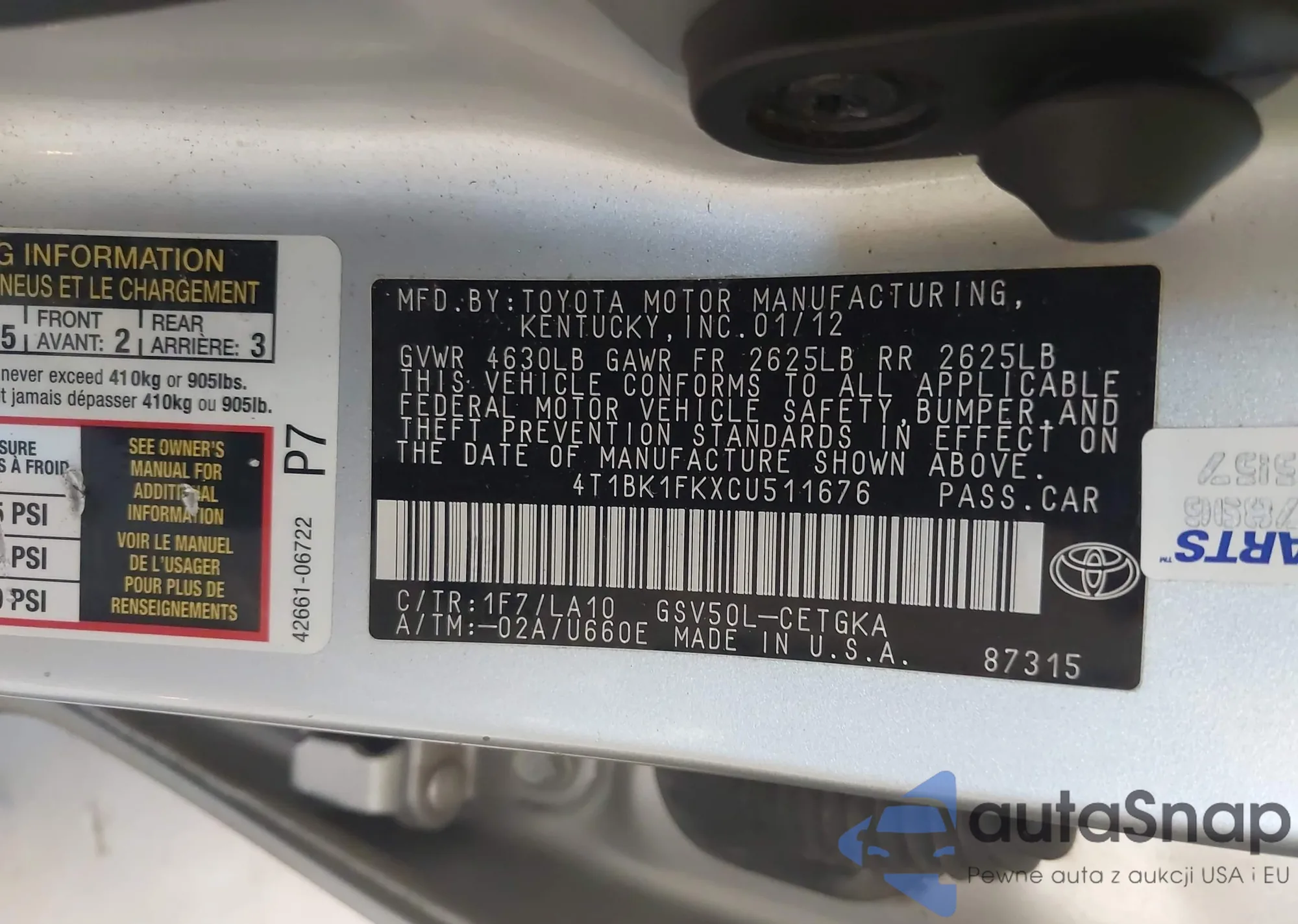 LOT: 42722733 VIN: 4T1BK1FKXCU511676
