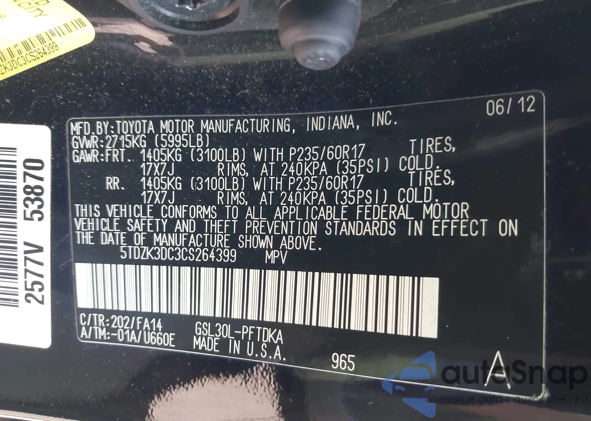 LOT: 42942928 VIN: 5TDZK3DC3CS264399