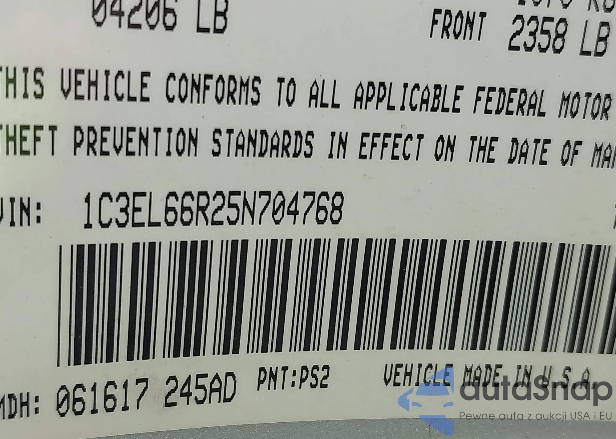 LOT: 42981786 VIN: 1C3EL66R25N704768