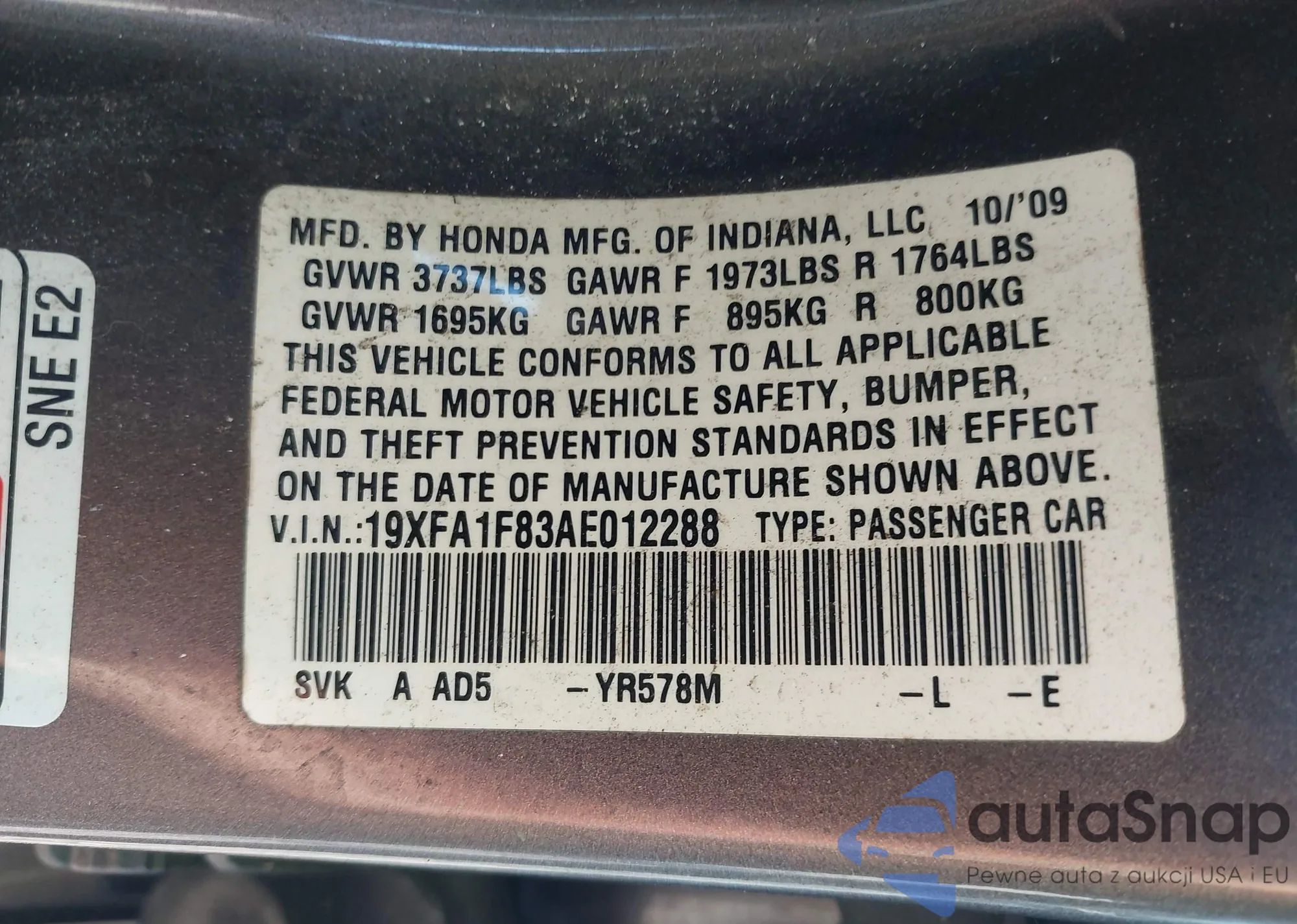 LOT: 38880609 VIN: 19XFA1F83AE012288