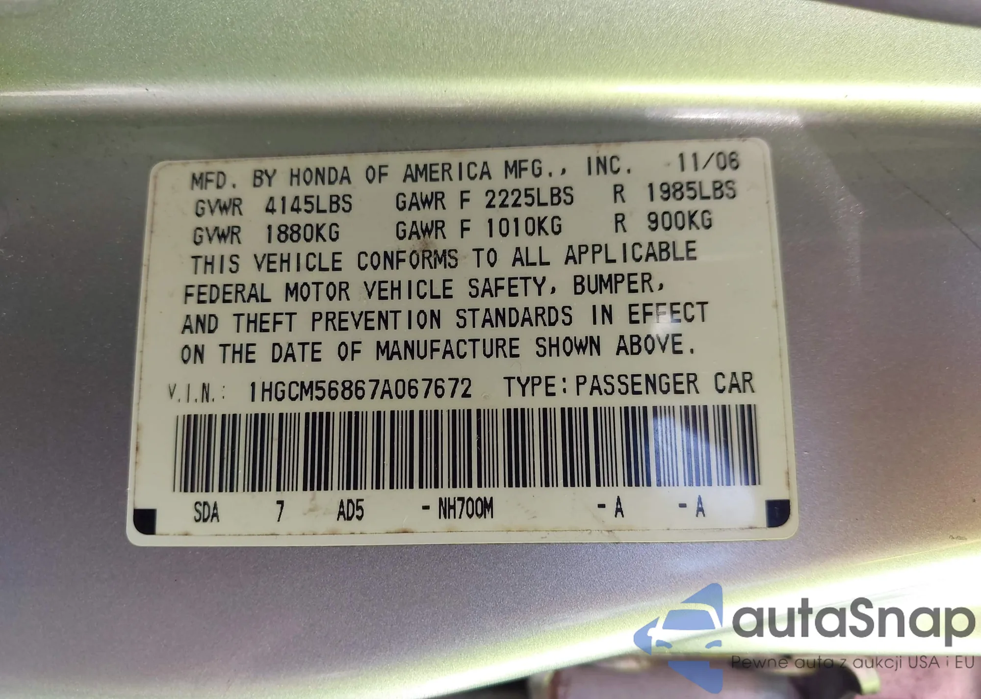 LOT: 42774606 VIN: 1HGCM56867A067672
