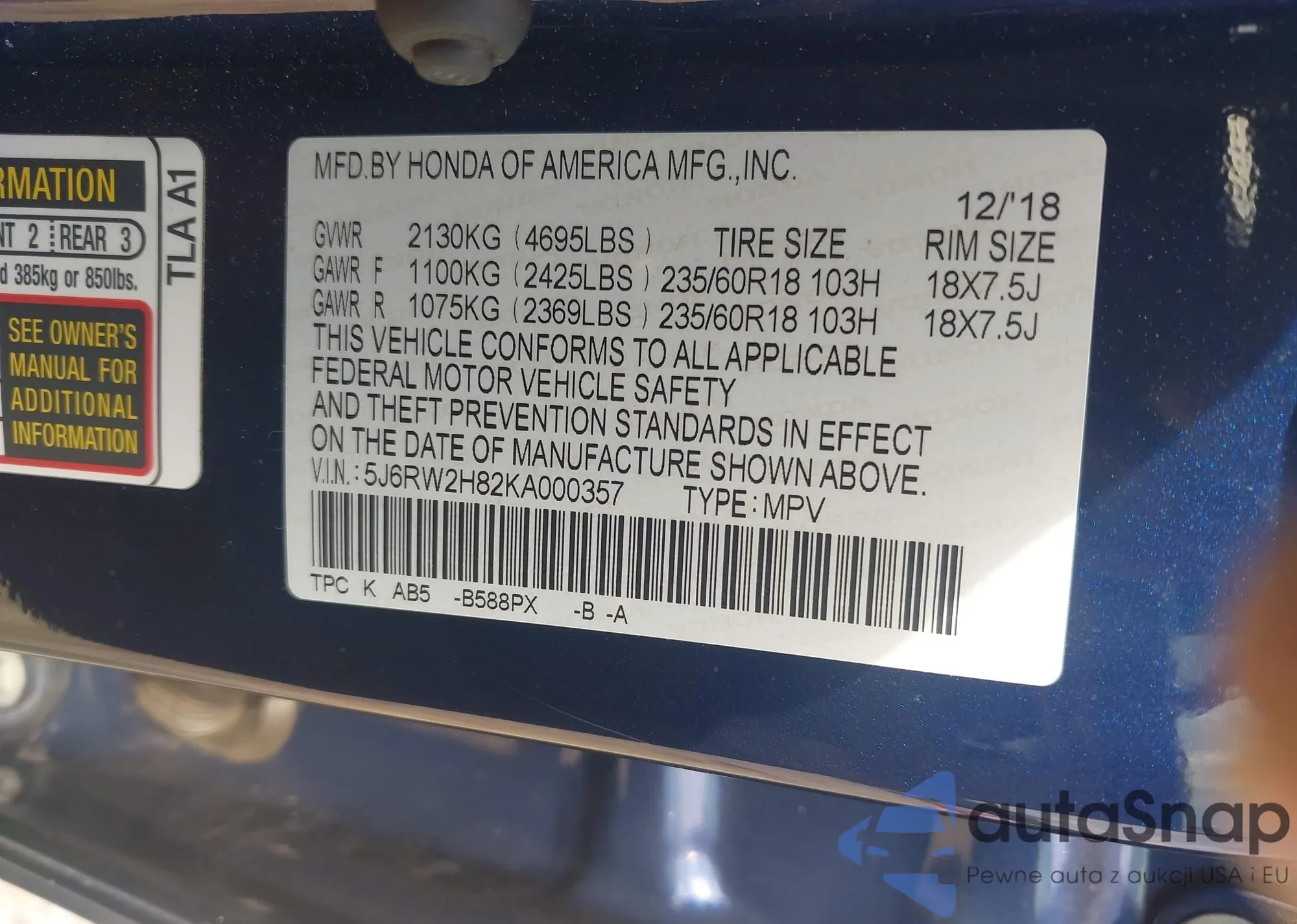 • VIN 5J6RW2H82KA000357