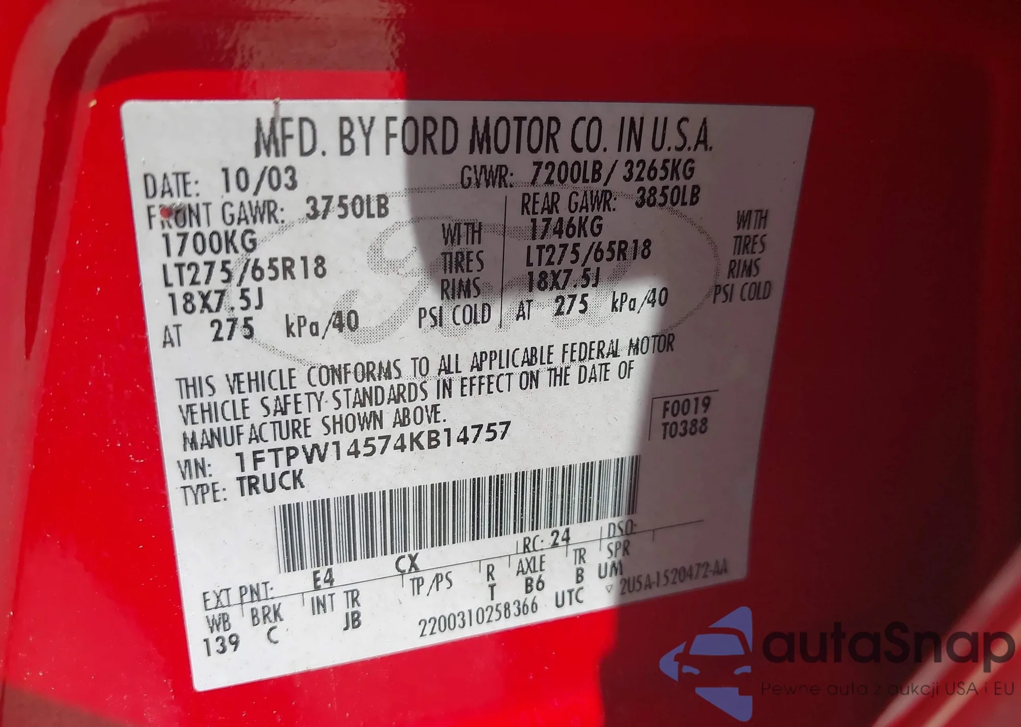 • VIN 1FTPW14574KB14757