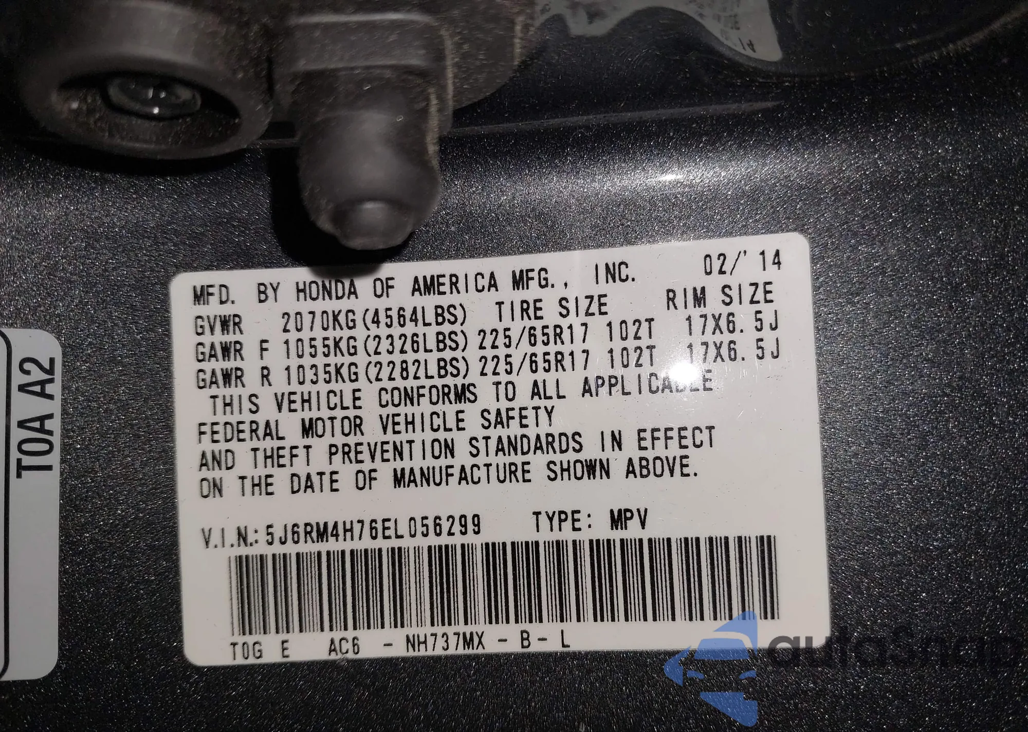 • VIN 5J6RM4H76EL056299