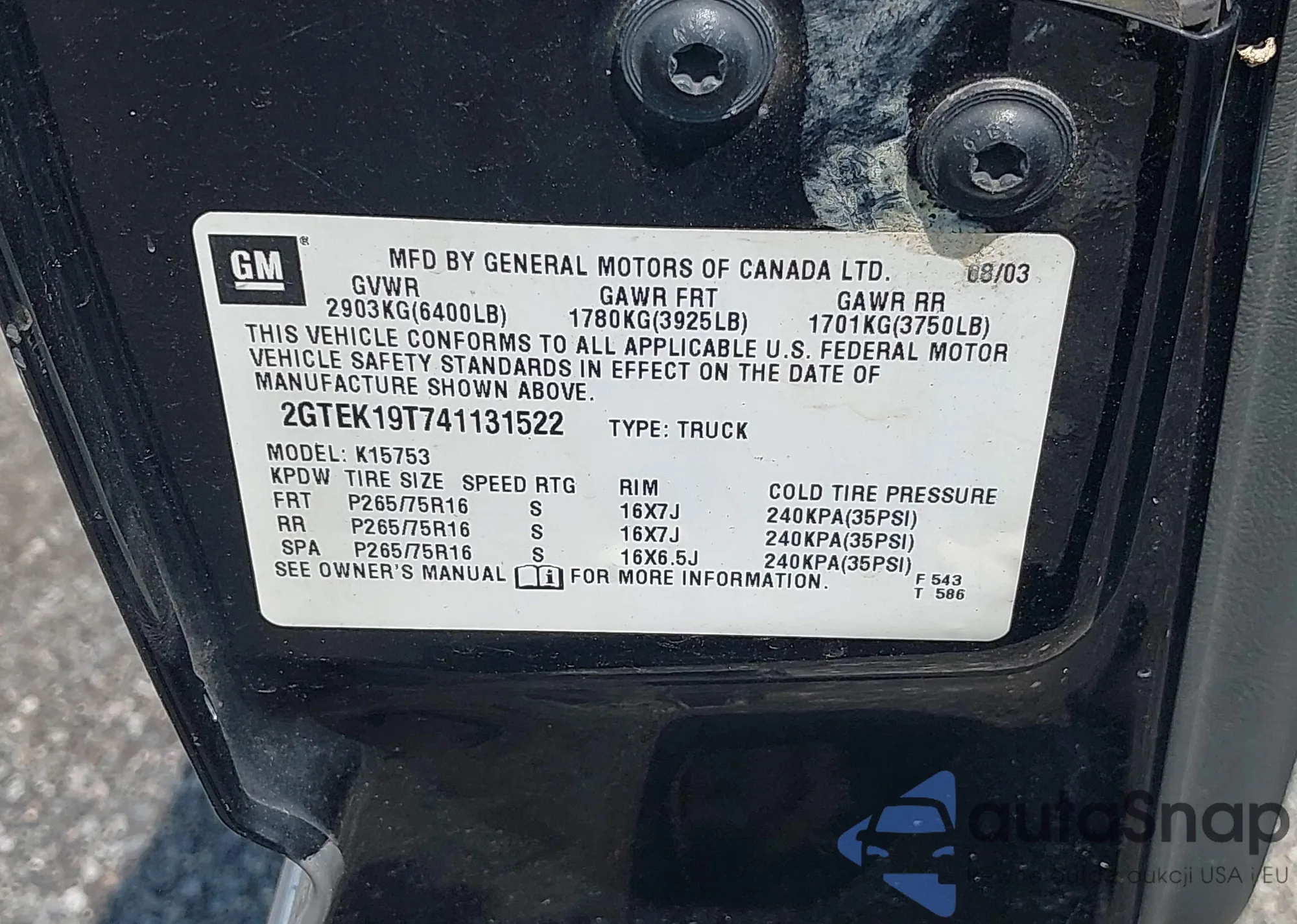 • VIN 2GTEK19T741131522