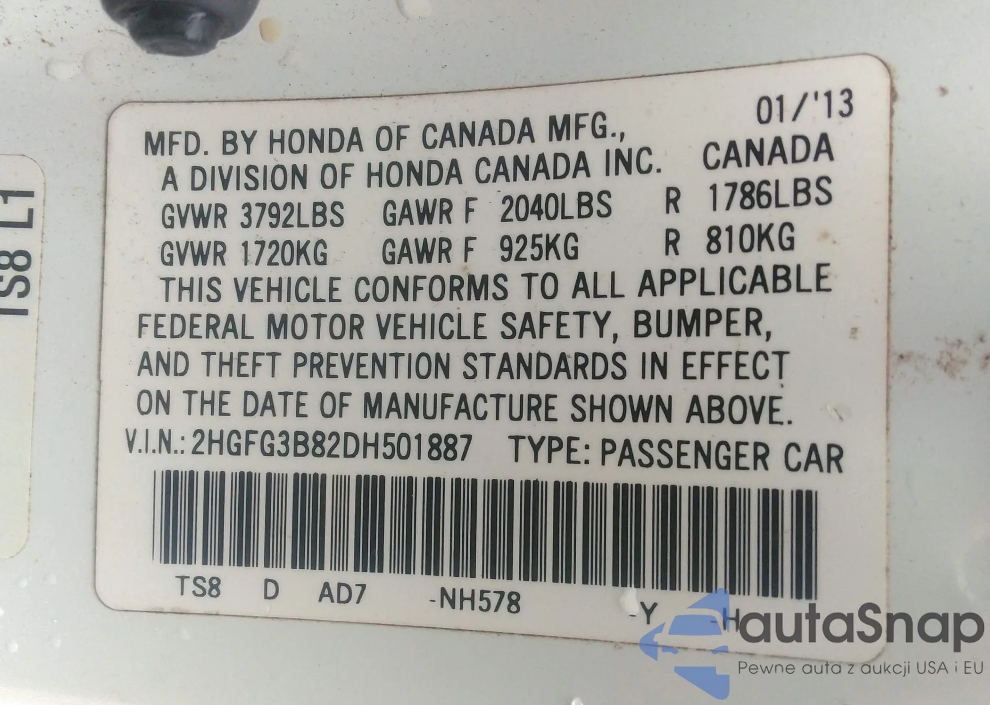 LOT: 42904660 VIN: 2HGFG3B82DH501887