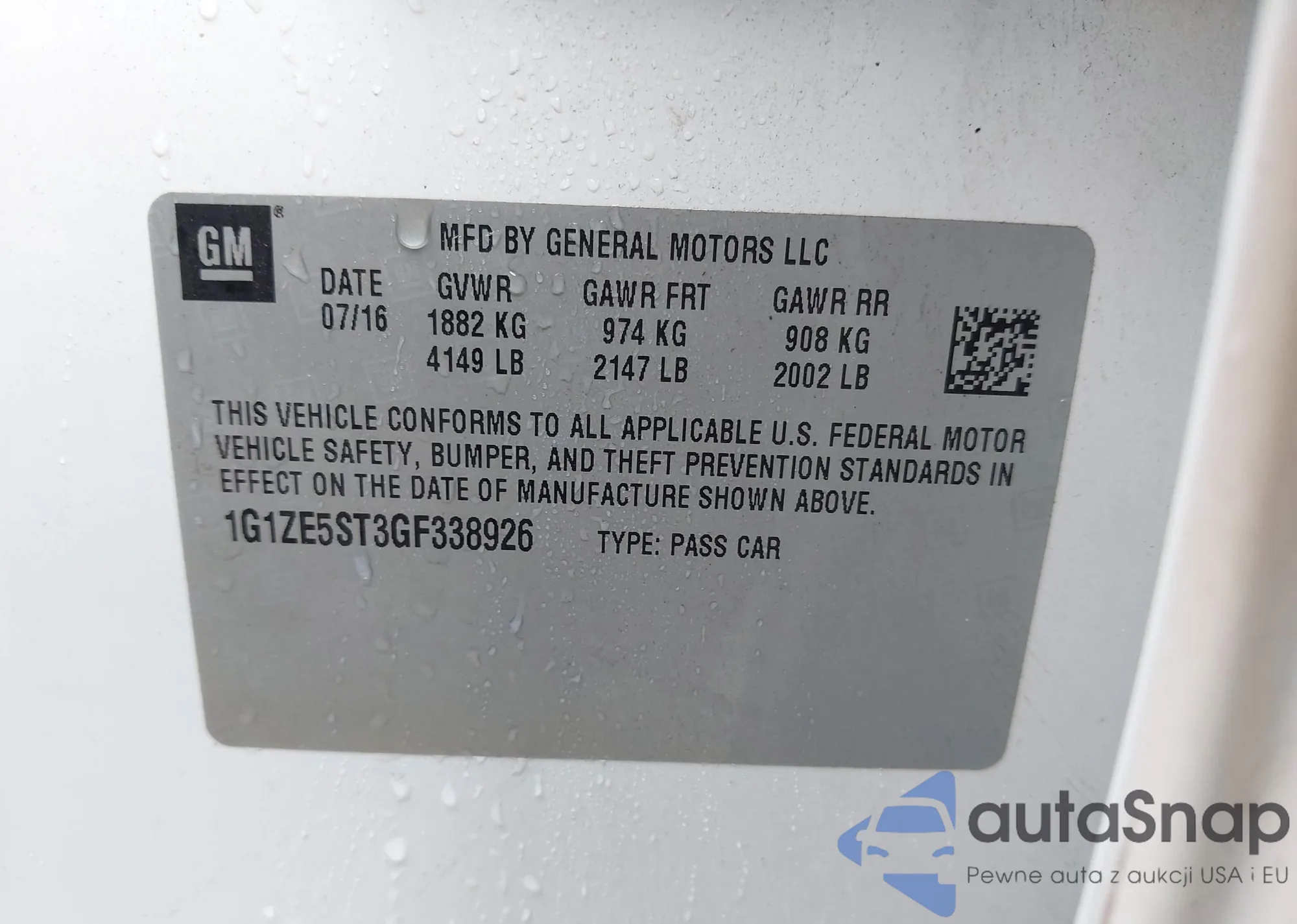 • VIN 1G1ZE5ST3GF338926
