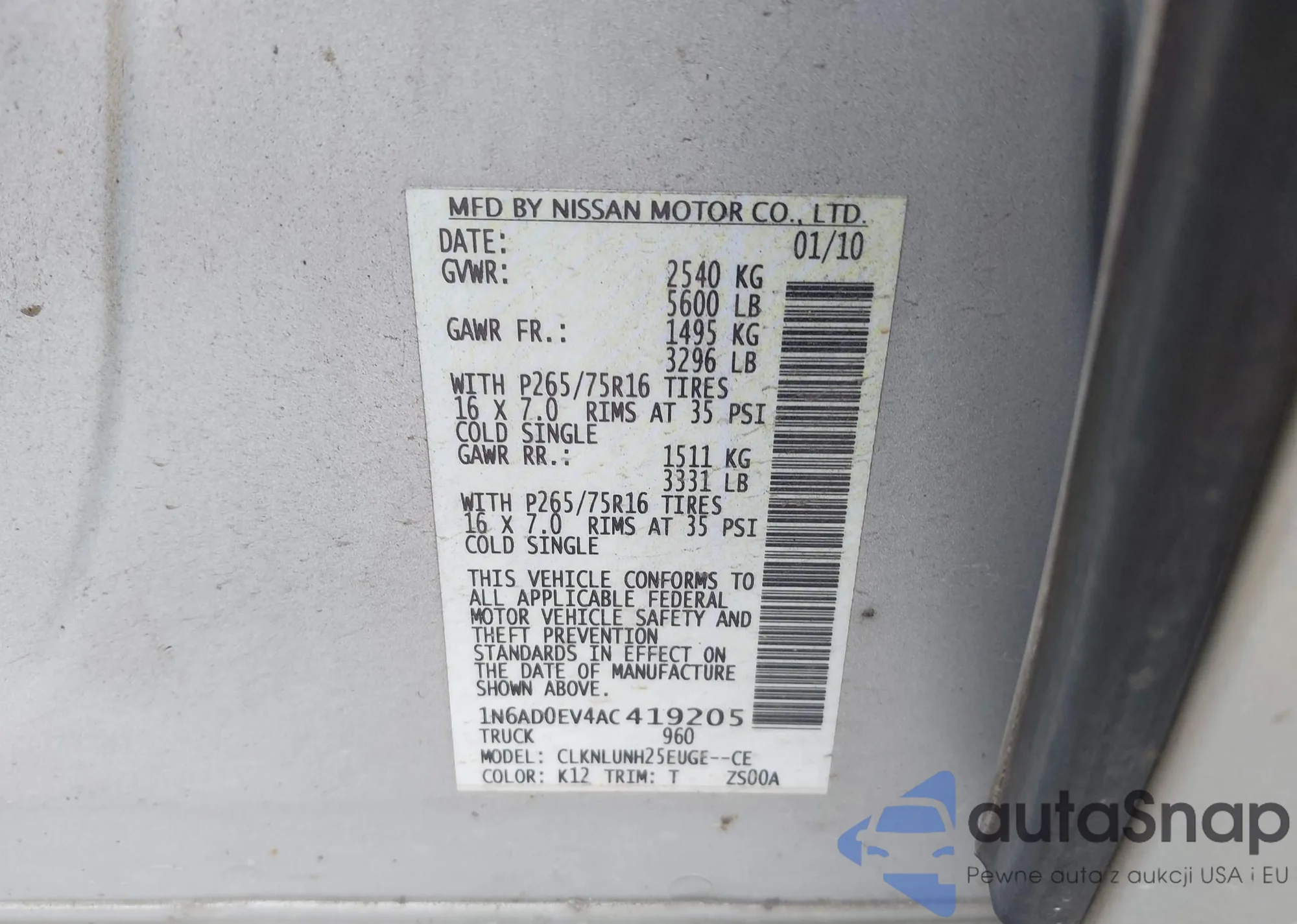 2010 Nissan Frontier Pro-4X z USA, uszkodzony, nr VIN 1N6AD0EV4AC419205