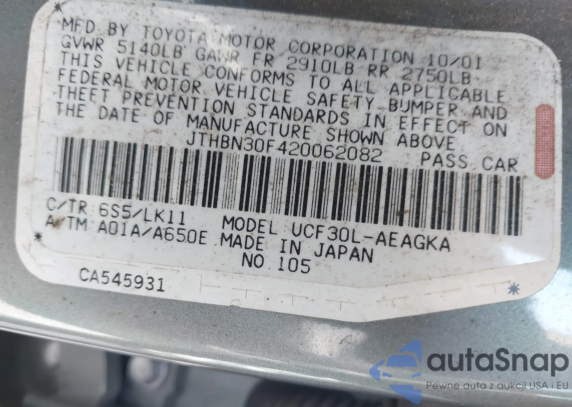 LOT: 42777029 VIN: JTKKT624560135494