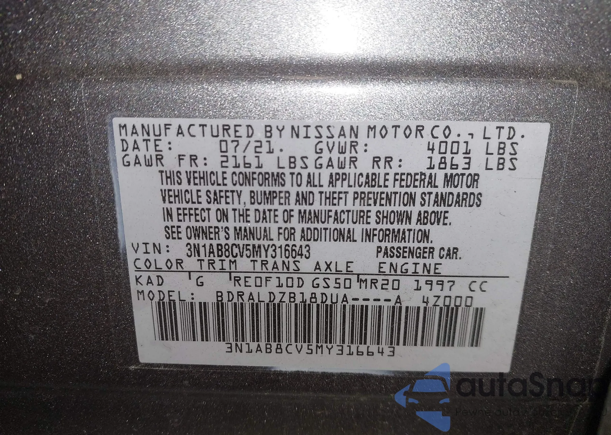 • VIN 3N1AB8CV5MY316643