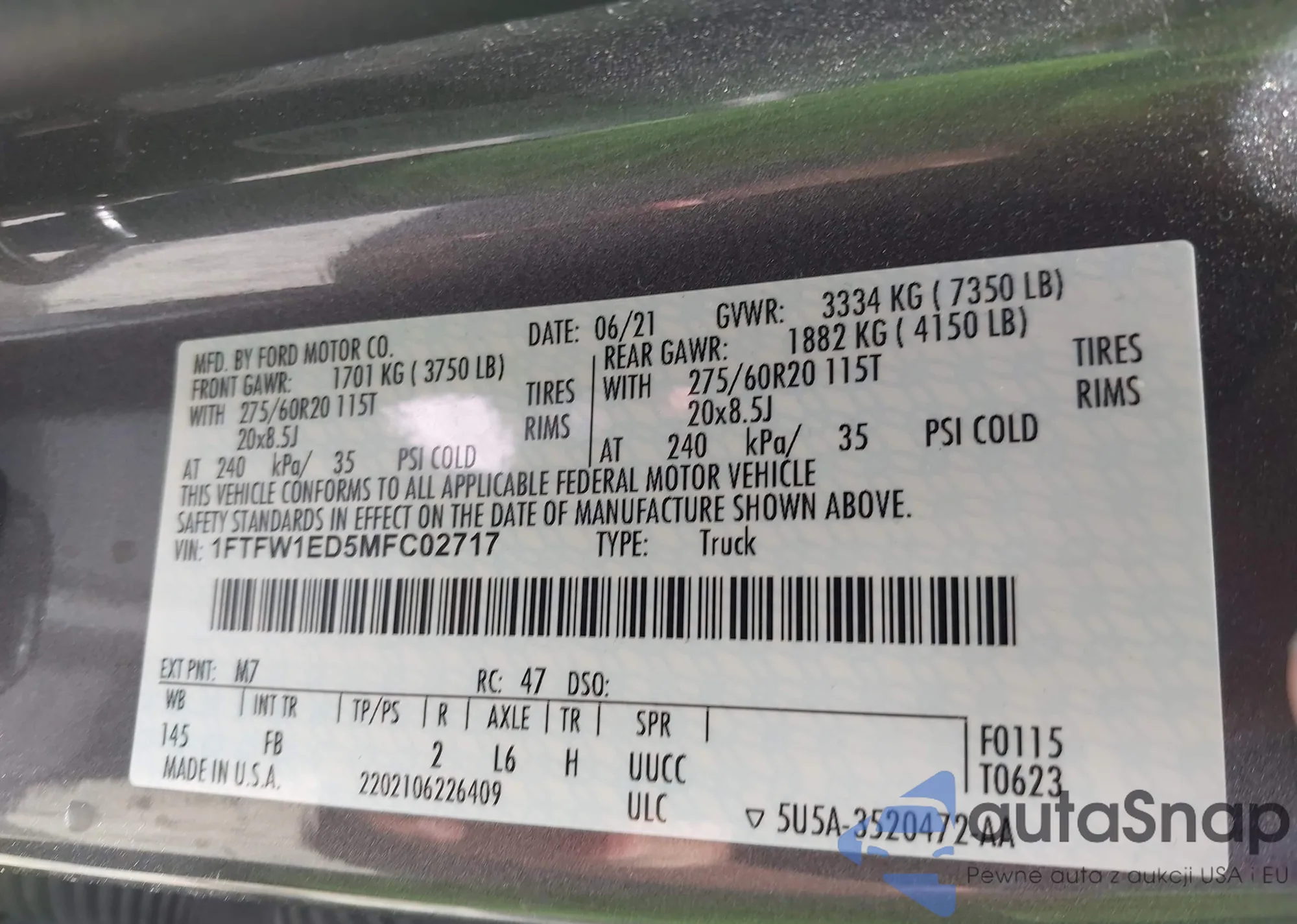 LOT: 42221030 VIN: 1FTFW1ED5MFC02717