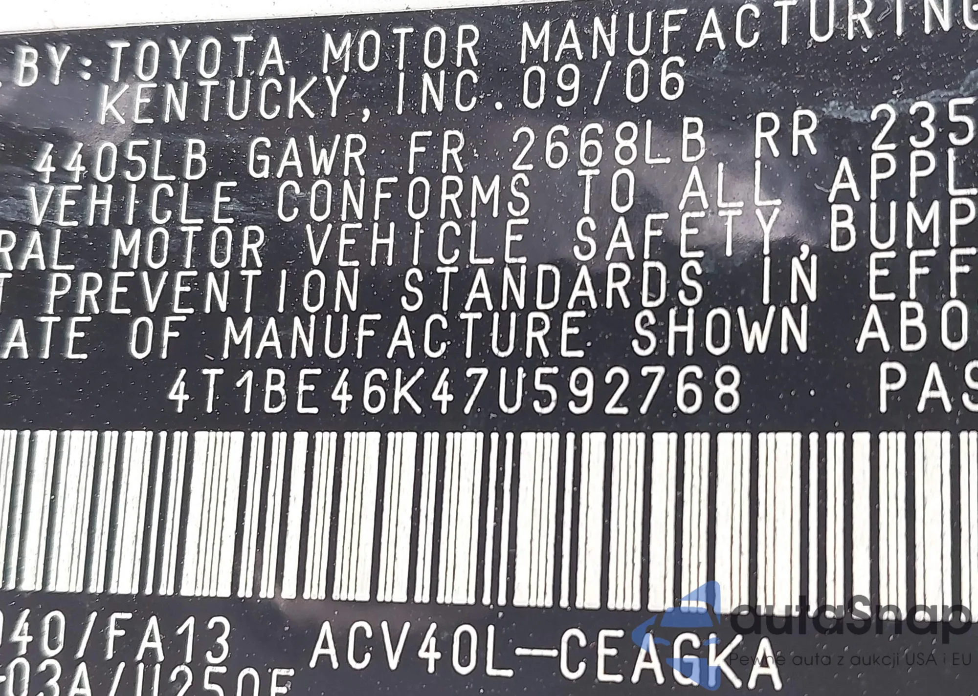LOT: 42598032 VIN: 4T1BE46K47U592768