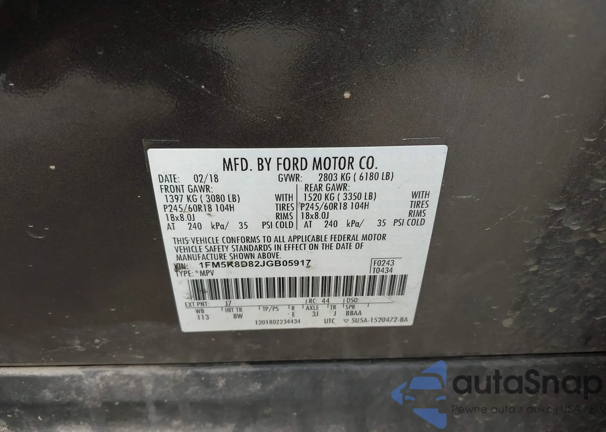 LOT: 42693901 VIN: 1FM5K8D82JGB05917