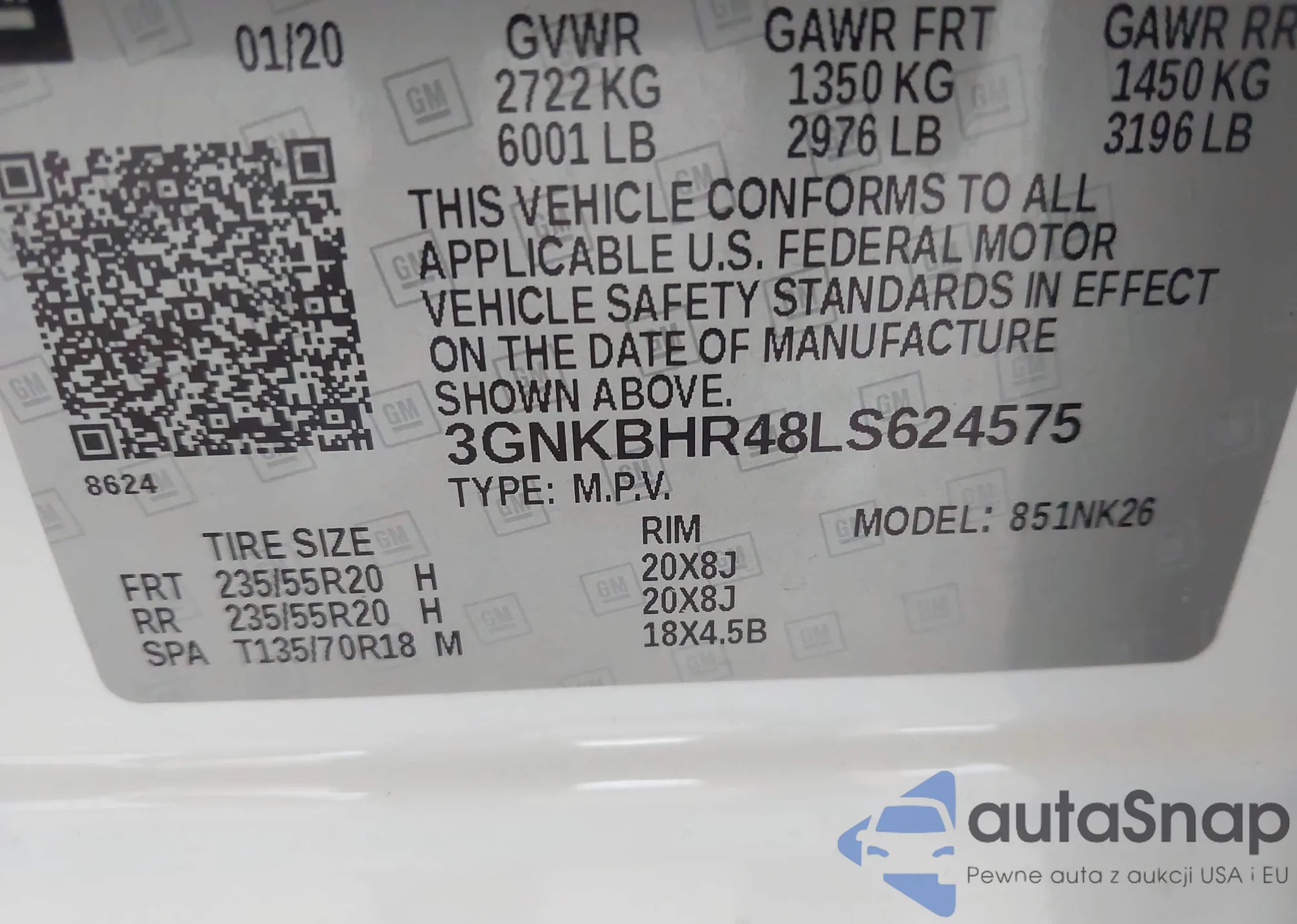 LOT: 42579026 VIN: 3GNKBHR48LS624575