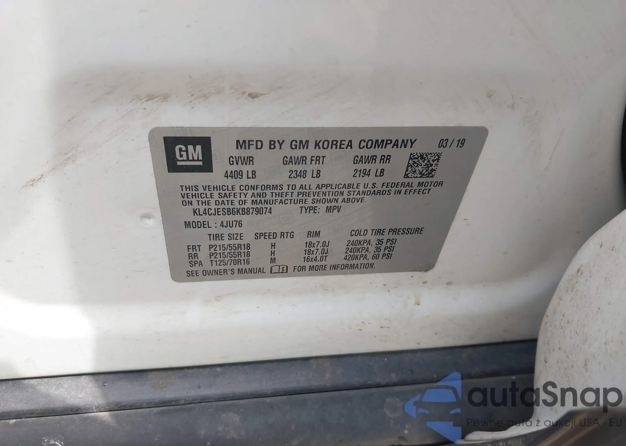 • VIN KL4CJESB6KB879074