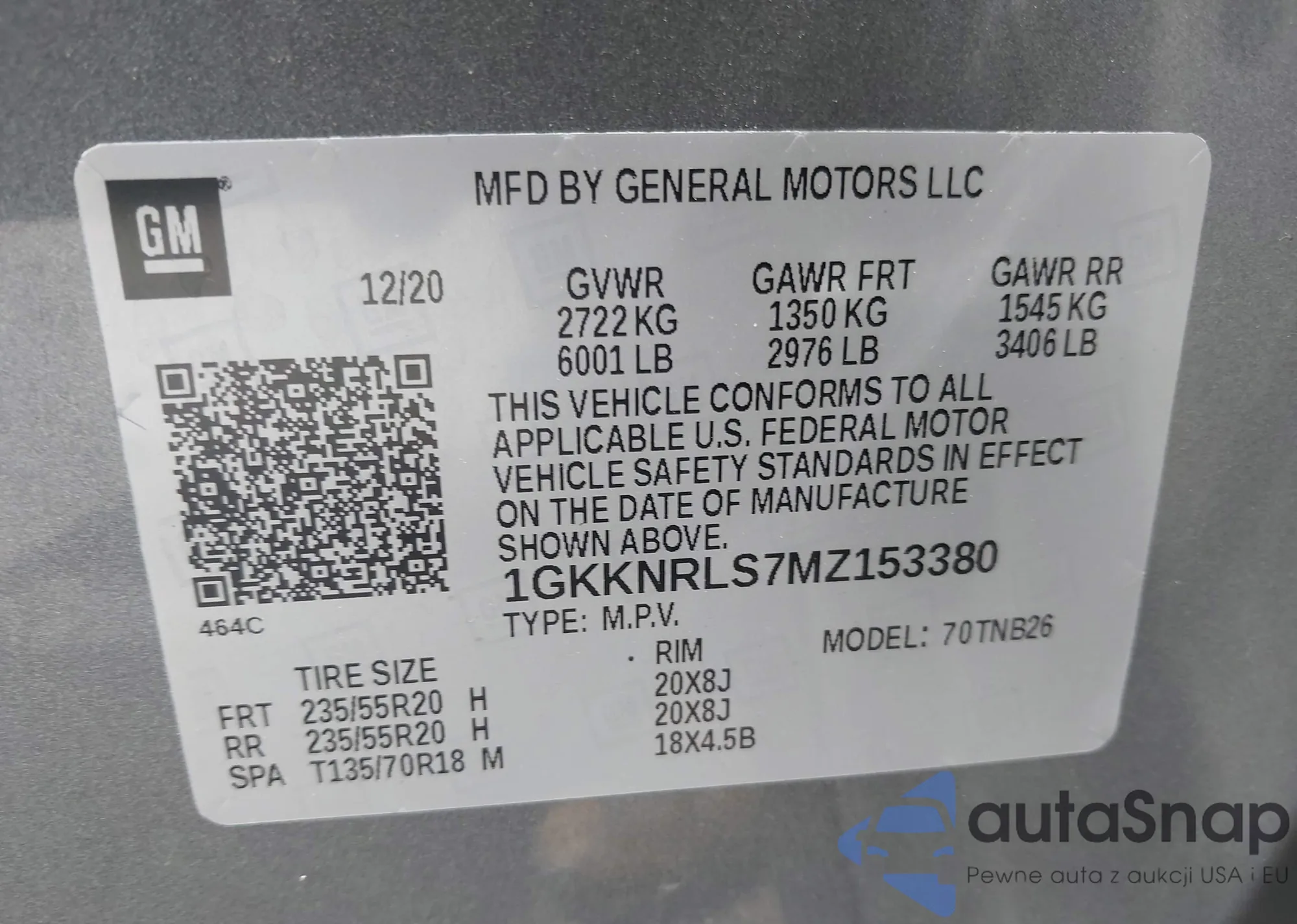 LOT: 42355080 VIN: 1GKKNRLS7MZ153380