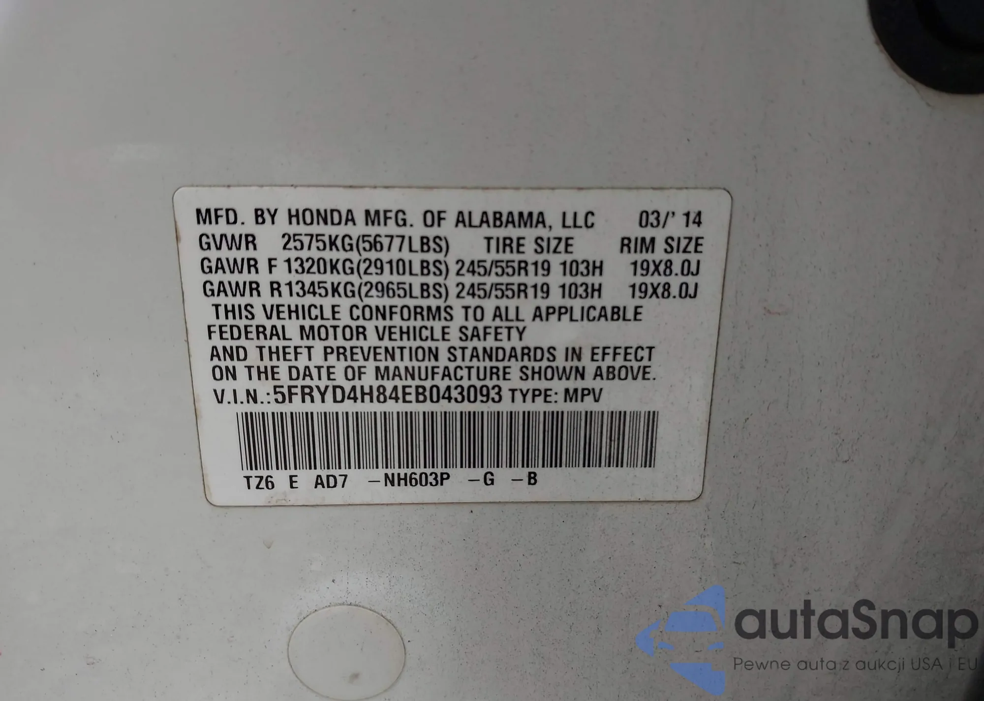LOT: 42867939 VIN: 5FNYF6H51MB062888