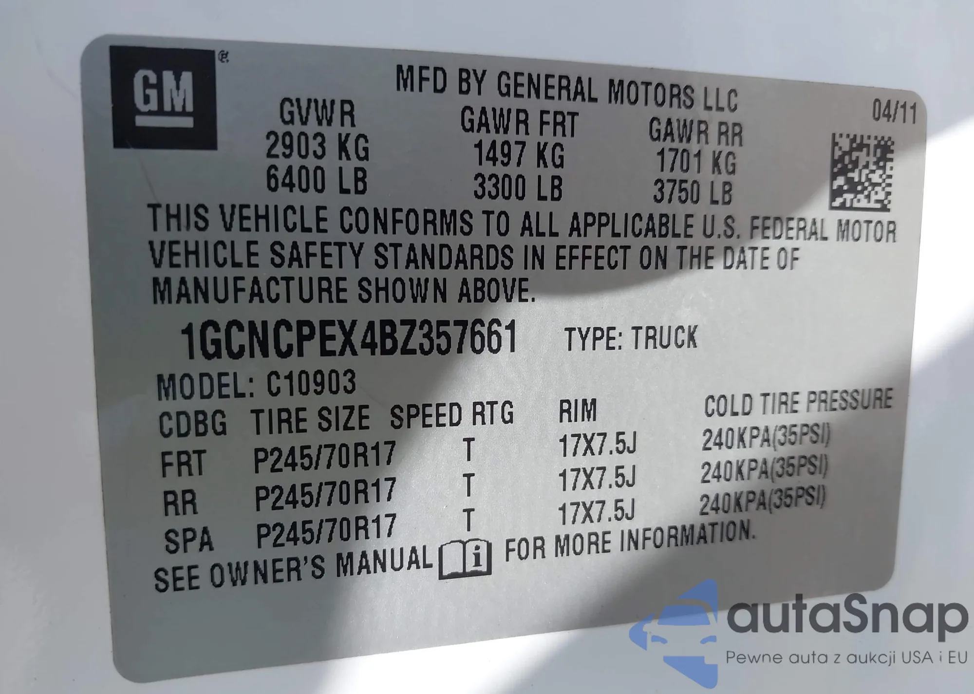 • VIN 1GCNCPEX4BZ357661
