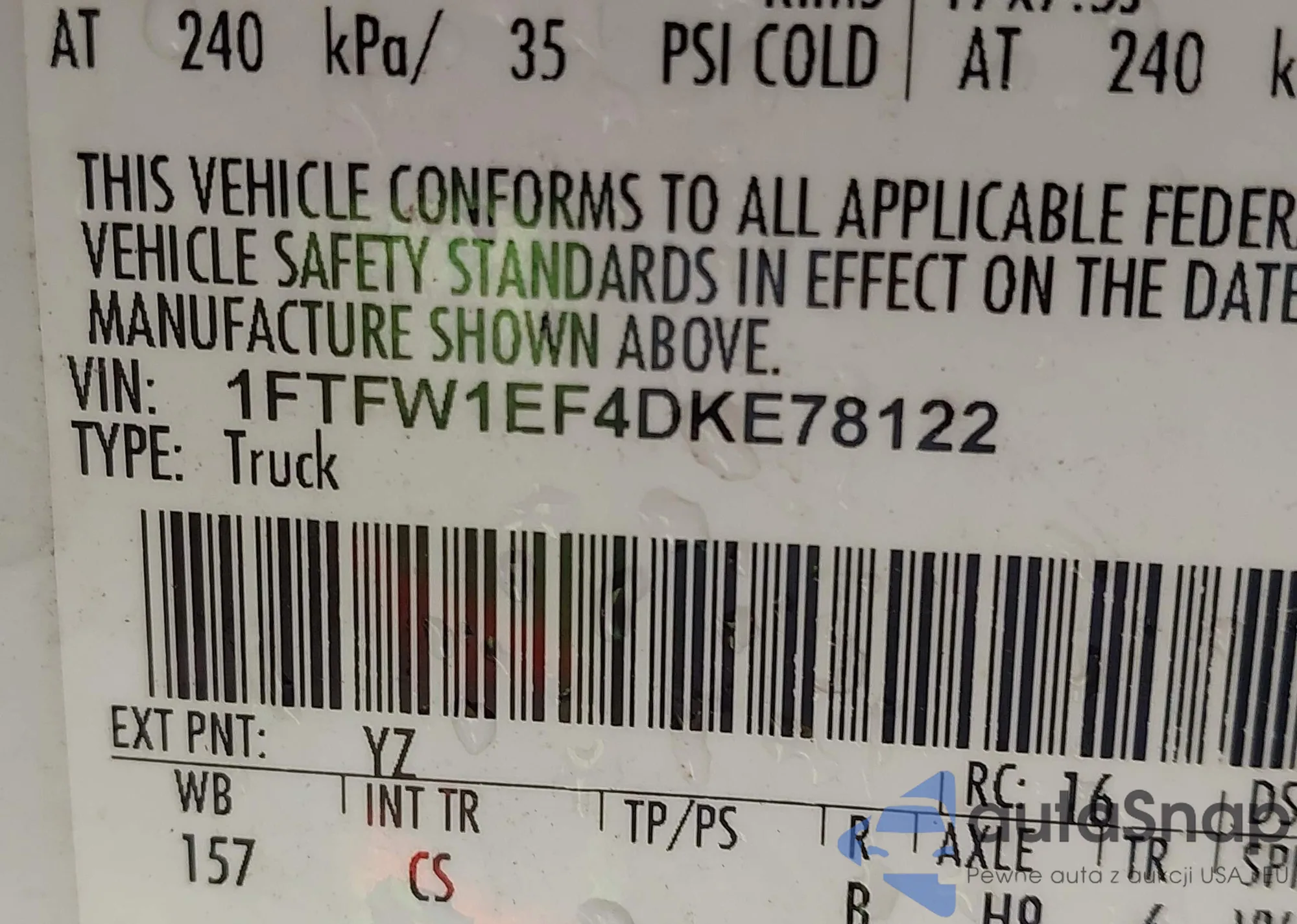 LOT: 42958321 VIN: 1FTFW1EF4DKE78122