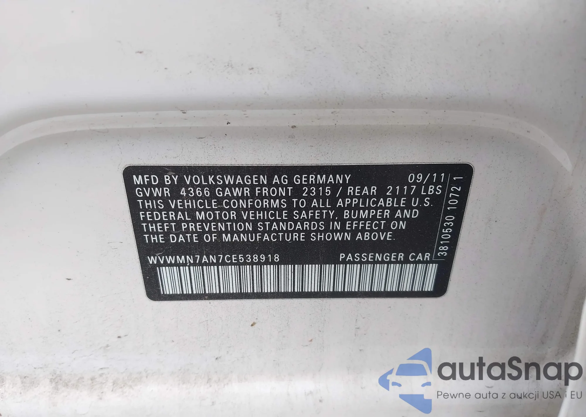 • VIN WVWMN7AN7CE538918
