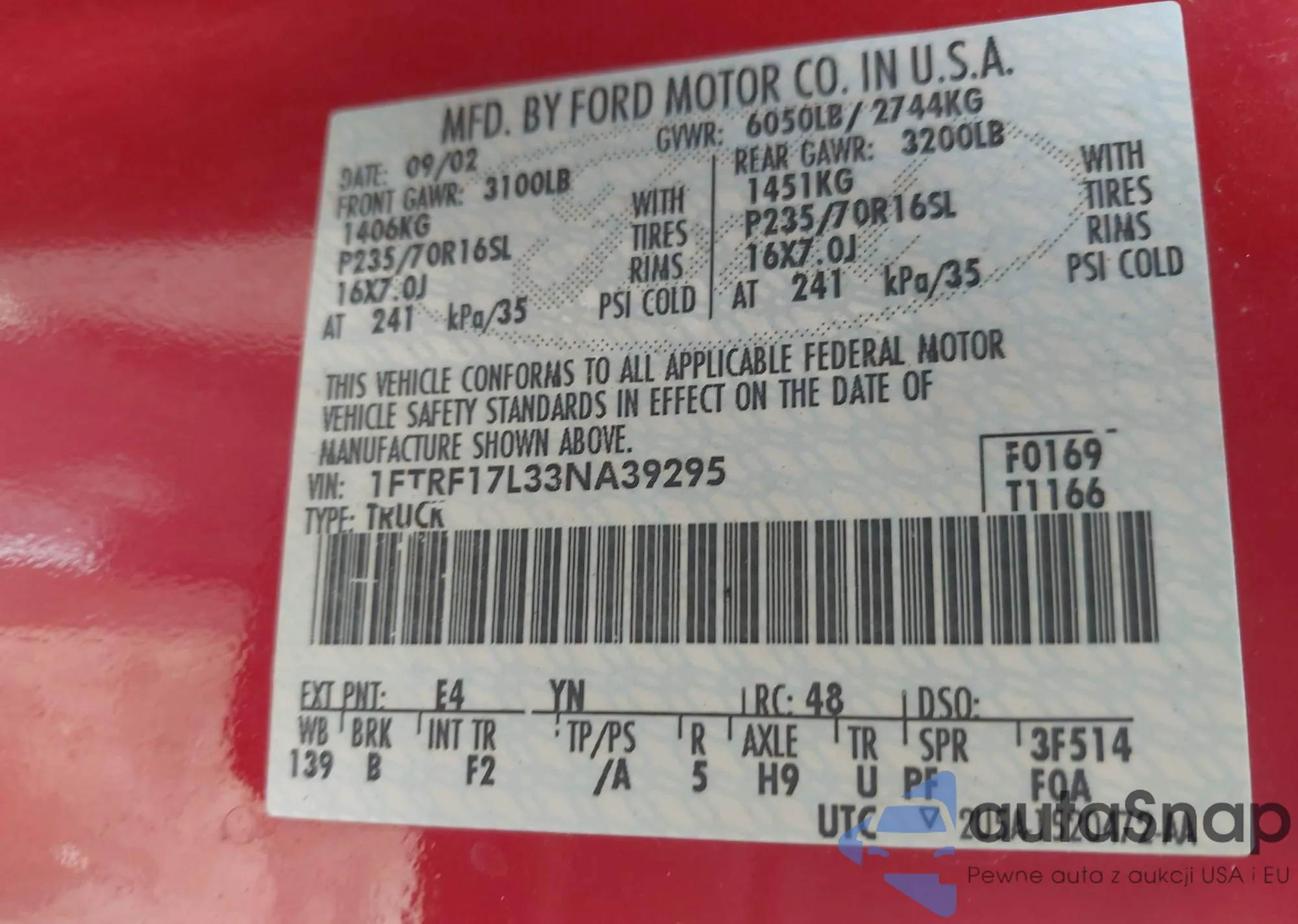 LOT: 42916901 VIN: 1FTRF17L33NA39295