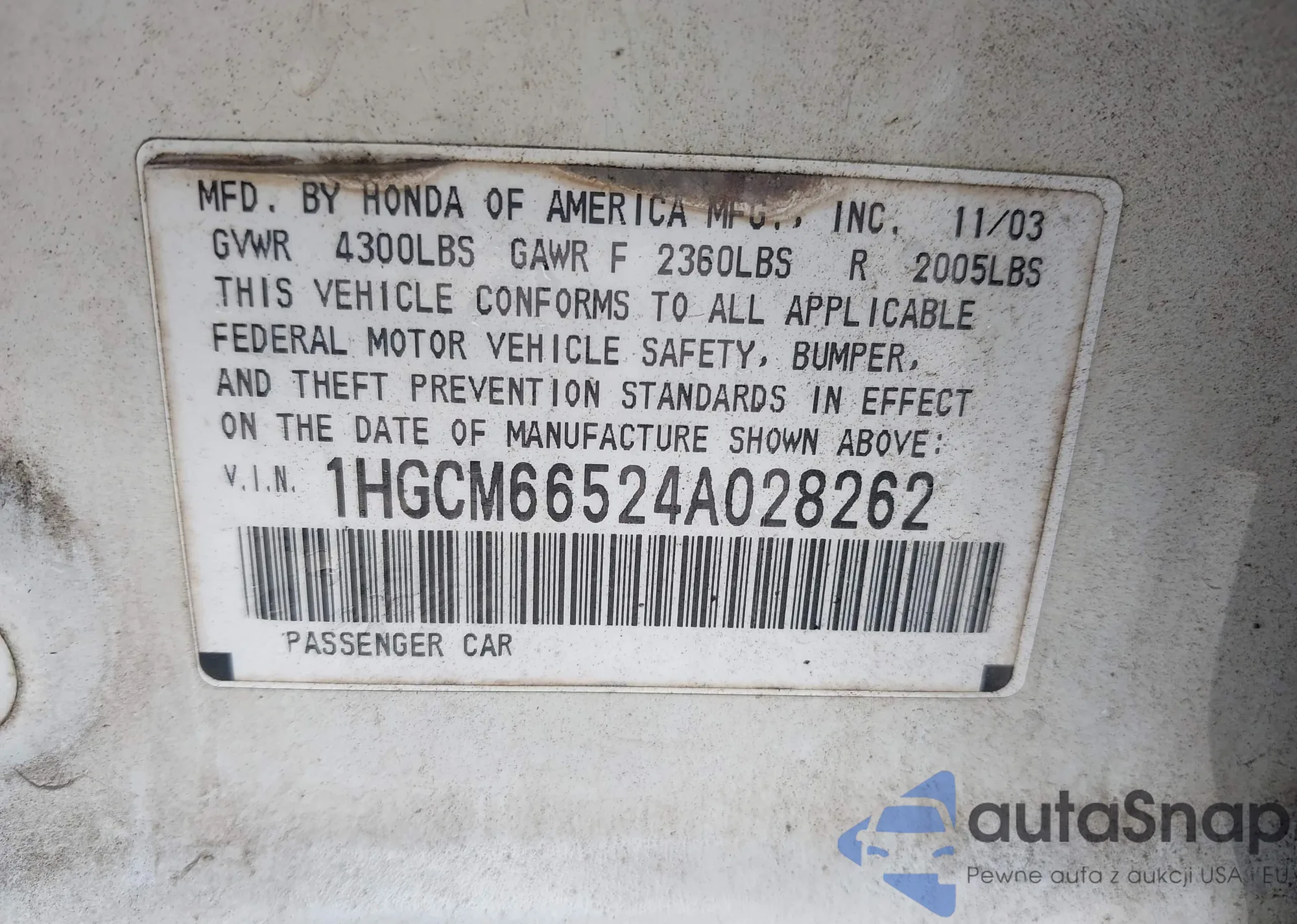 LOT: 42922798 VIN: 1HGCM66524A028262