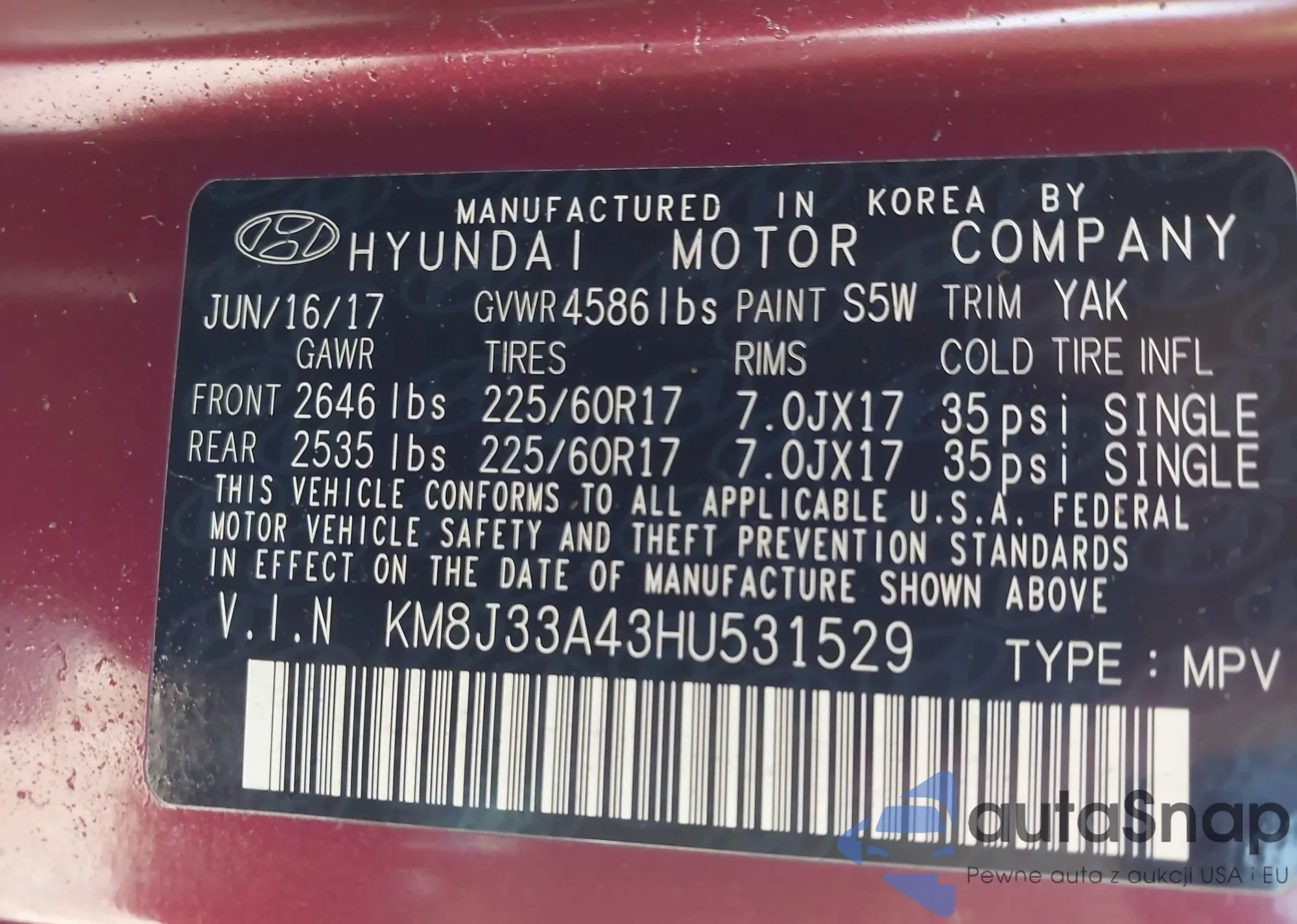 • VIN KM8J33A43HU531529