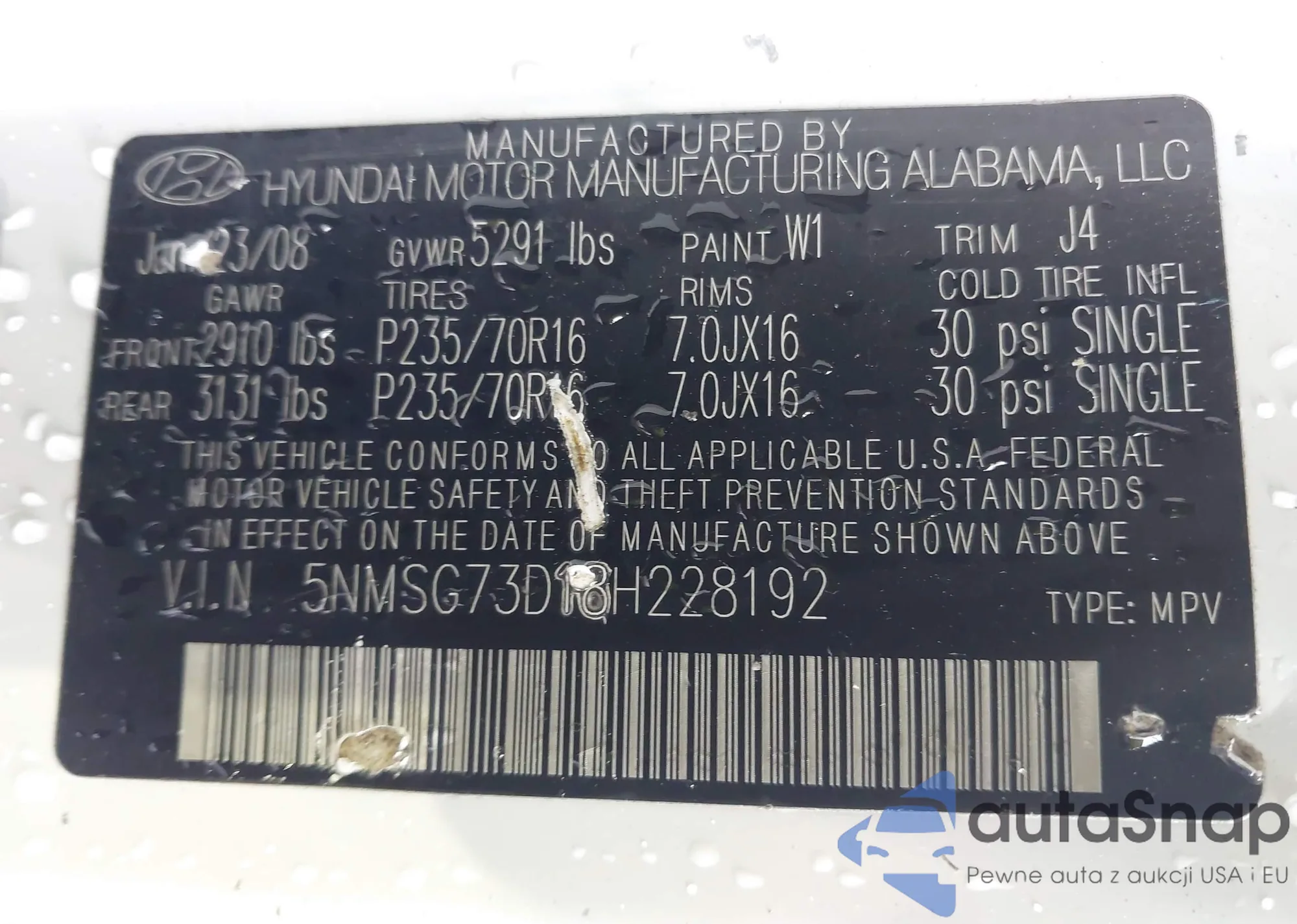 LOT: 42529498 VIN: 5NMSG73D18H228192