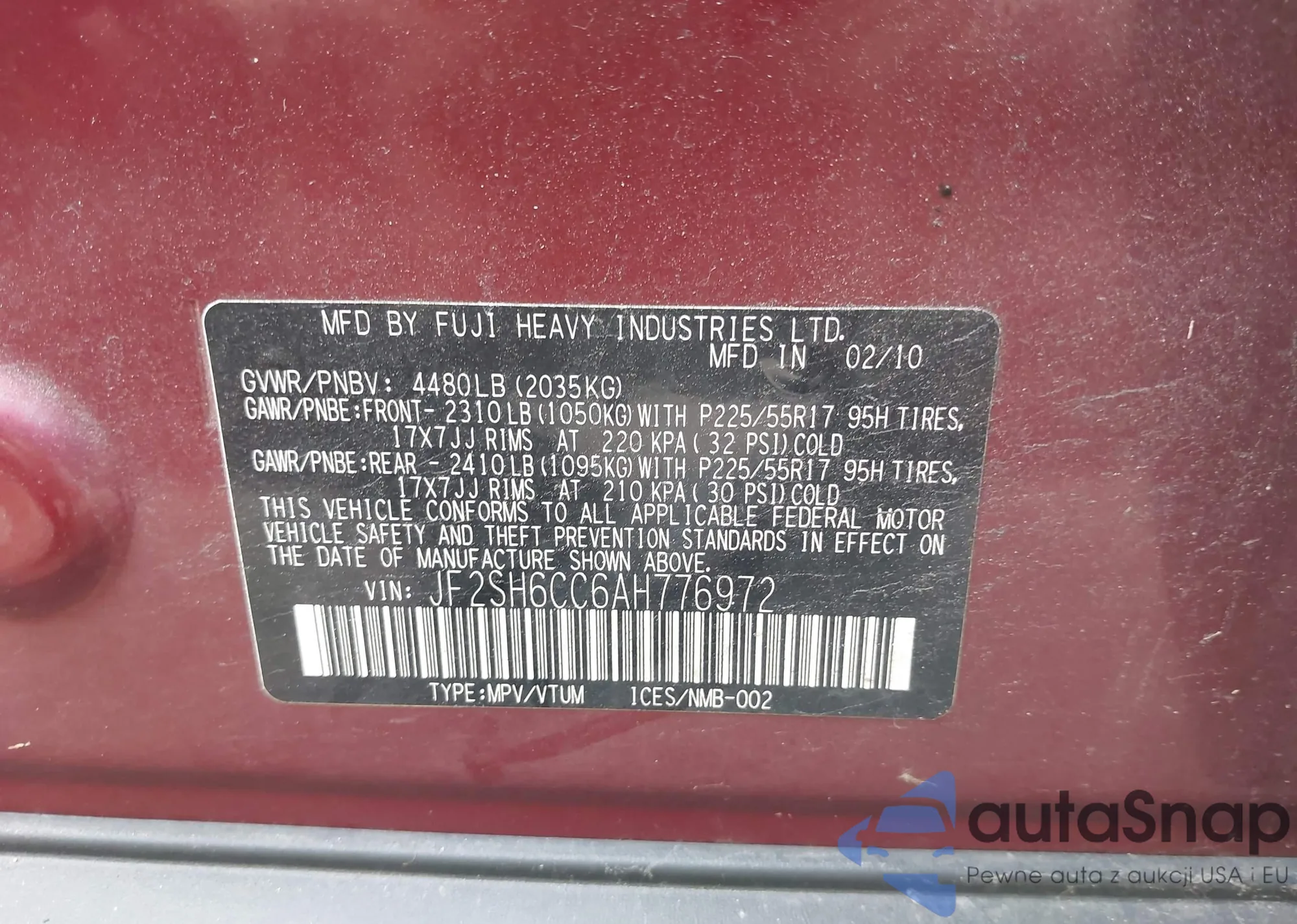 LOT: 42803226 VIN: JF2SH6CC6AH776972