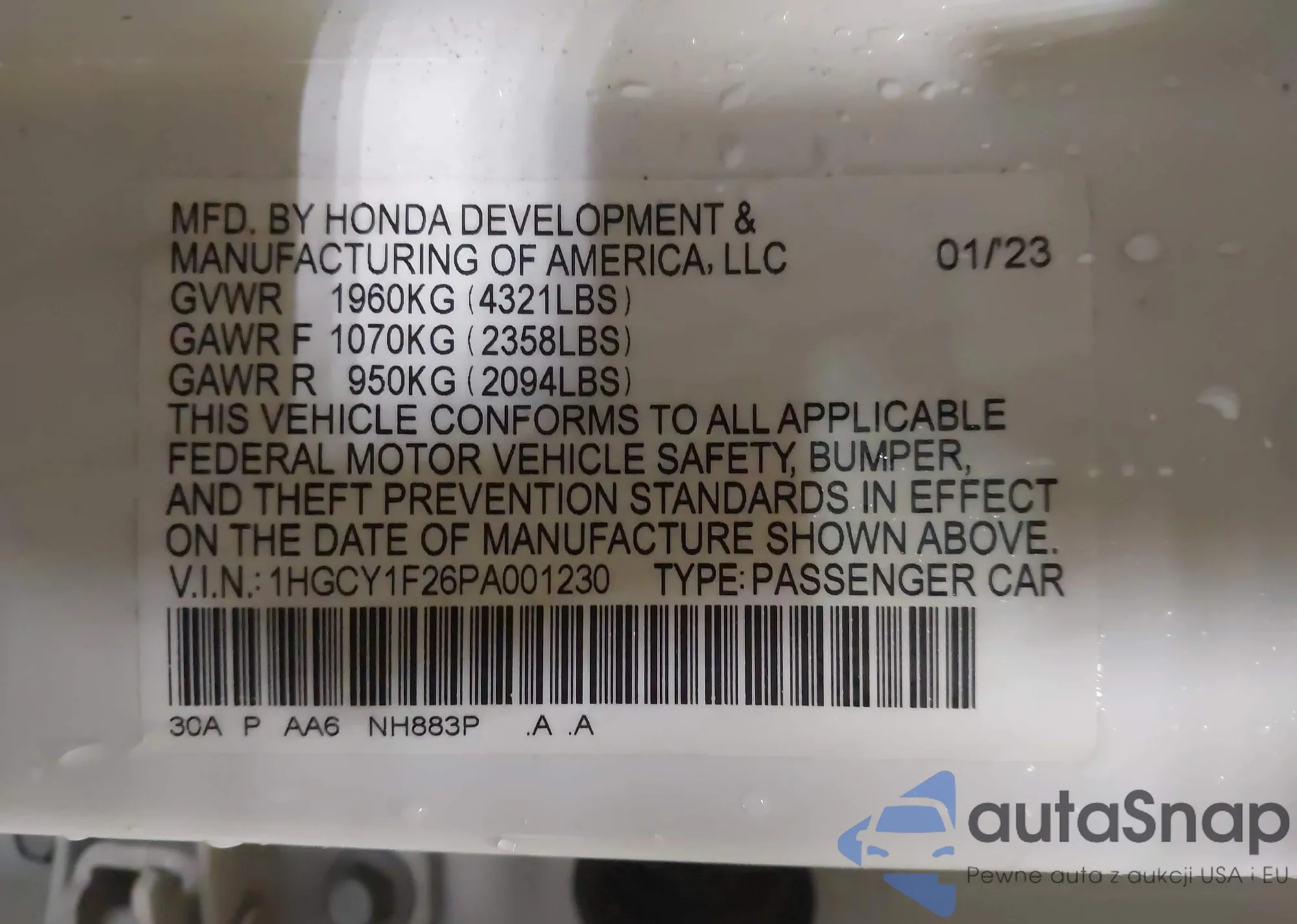 • VIN 1HGCY1F26PA001230