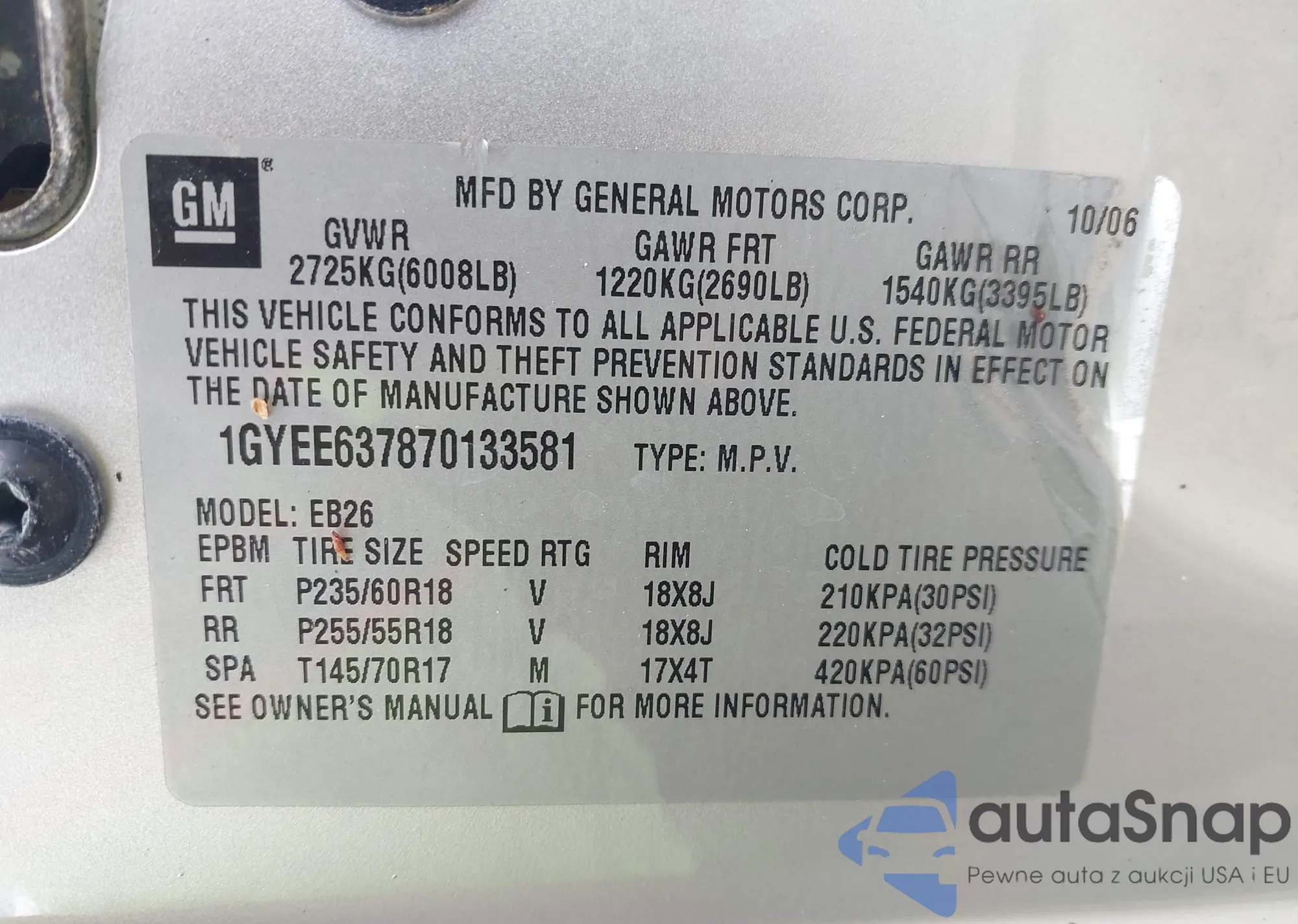 LOT: 43110206 VIN: 1GYEE637870133581