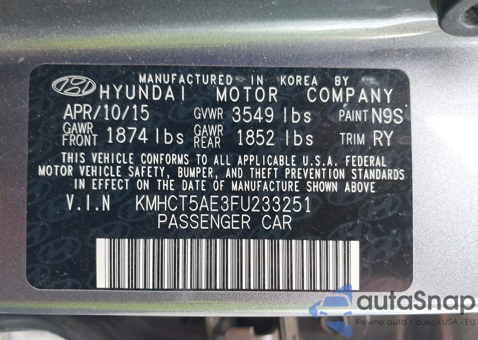 LOT: 42613072 VIN: KMHCT5AE3FU233251