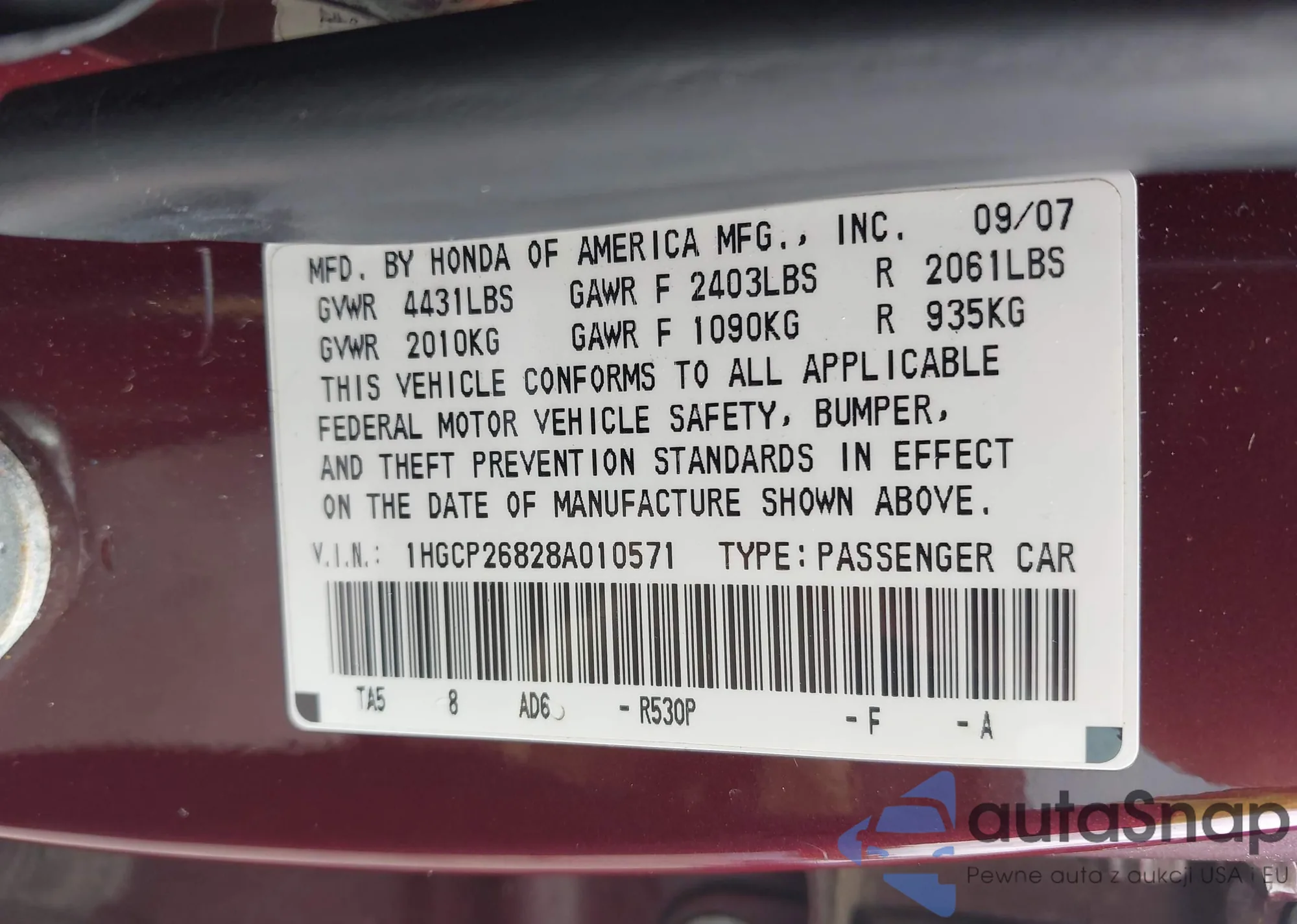 LOT: 42954252 VIN: 1HGCP26828A010571