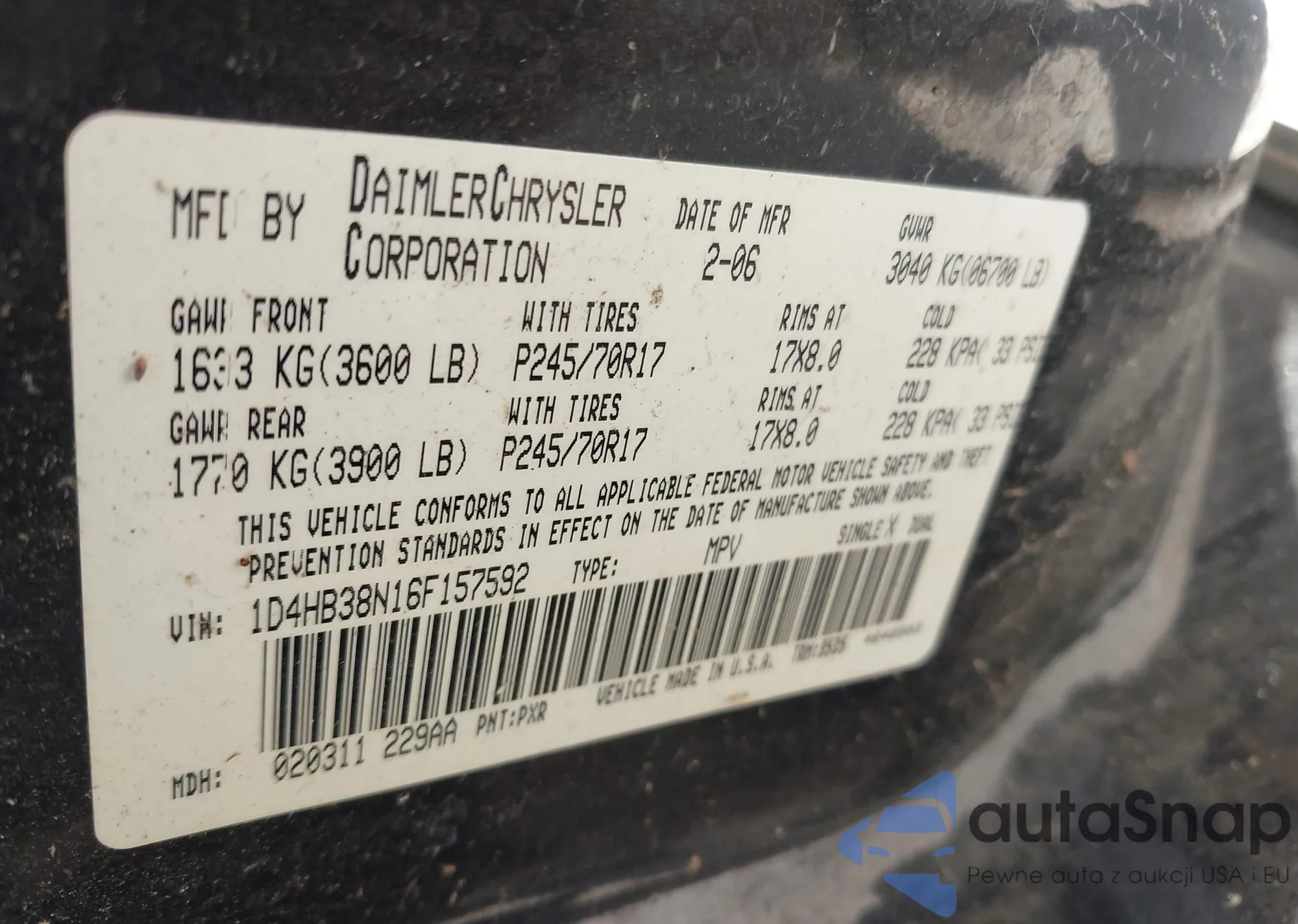 LOT: 43074889 VIN: 1D4HB38N16F157592