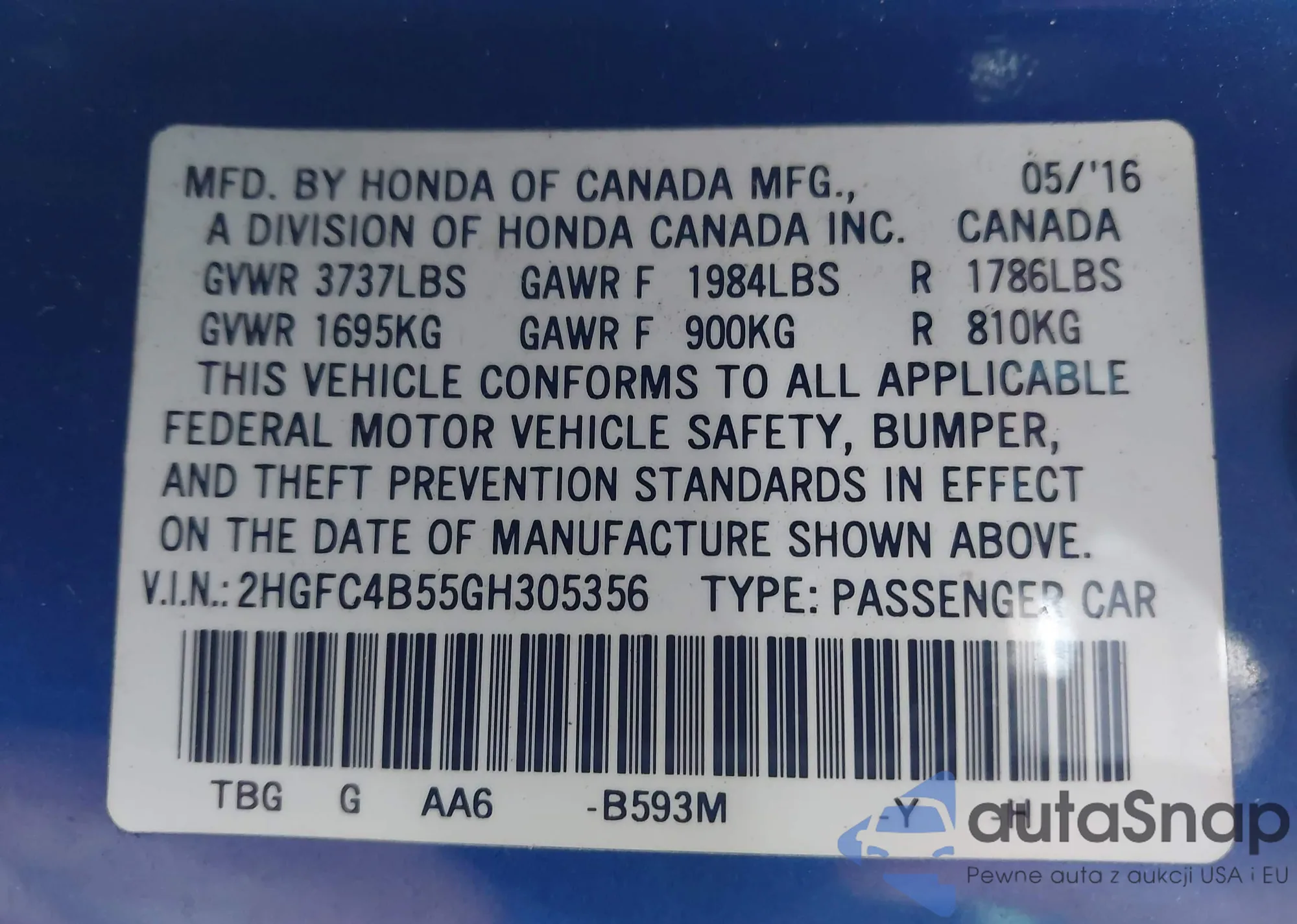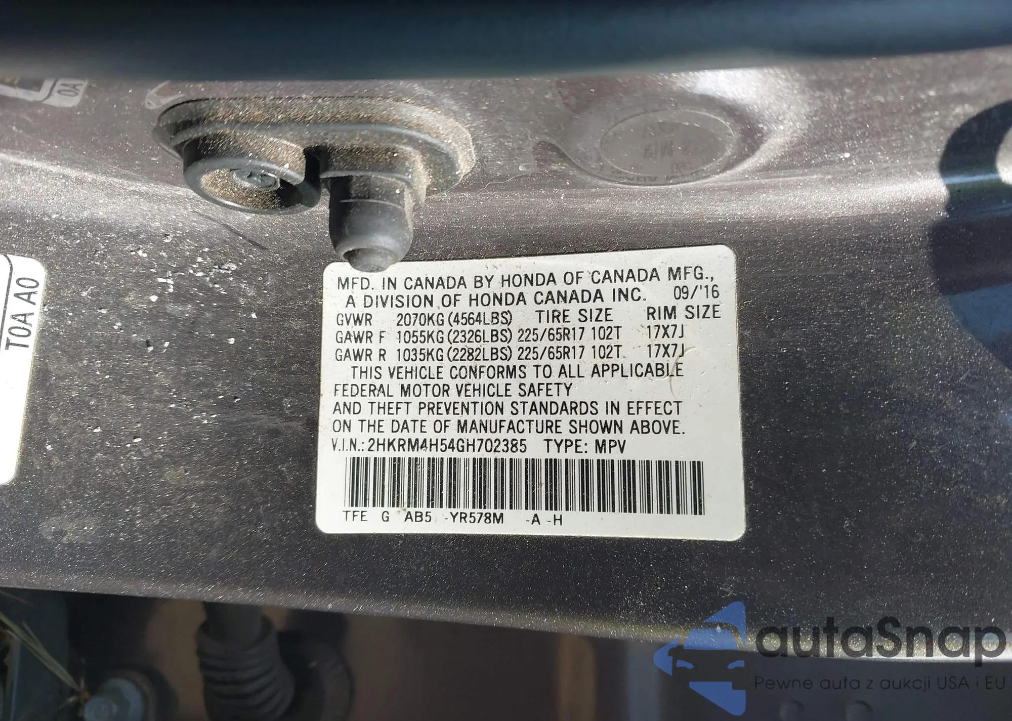 • VIN 2HKRM4H54GH702385