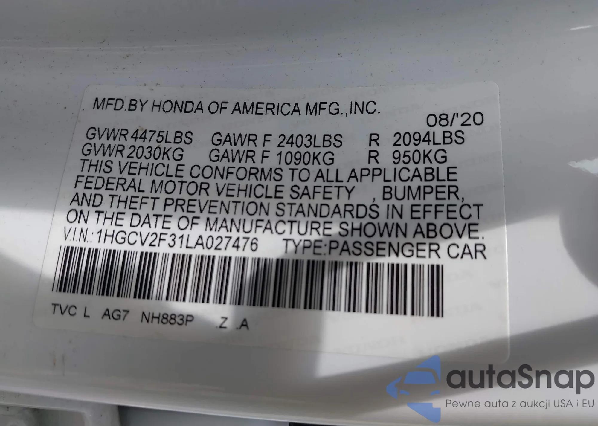 LOT: 42463086 VIN: 1HGCV2F31LA027476