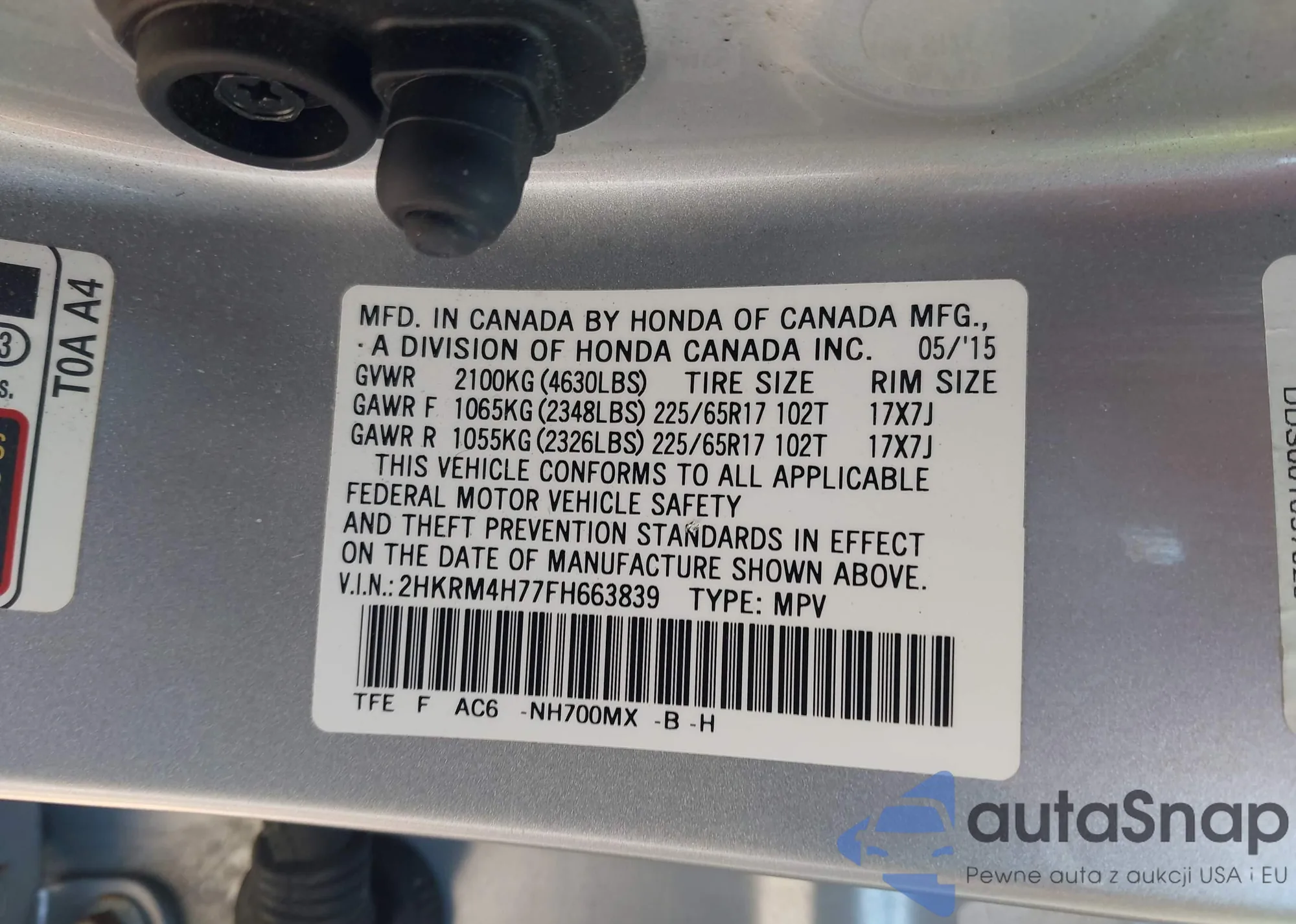 LOT: 42930680 VIN: 2HKRM4H77FH663839