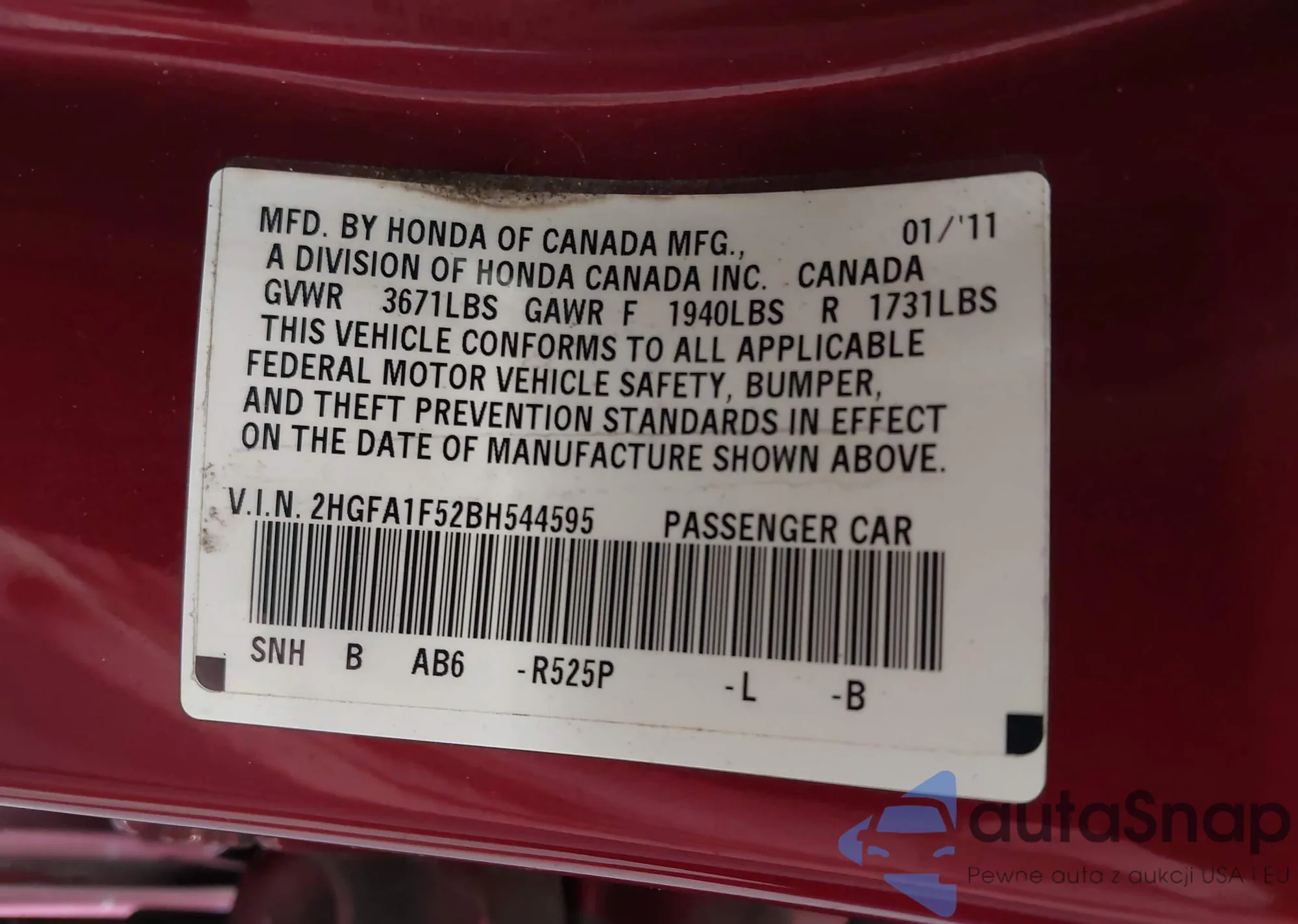 LOT: 42962319 VIN: 2HGFA1F52BH544595