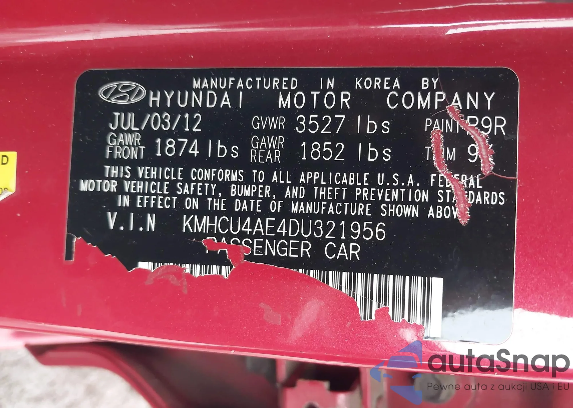 LOT: 42896618 VIN: KMHCU4AE4DU321956