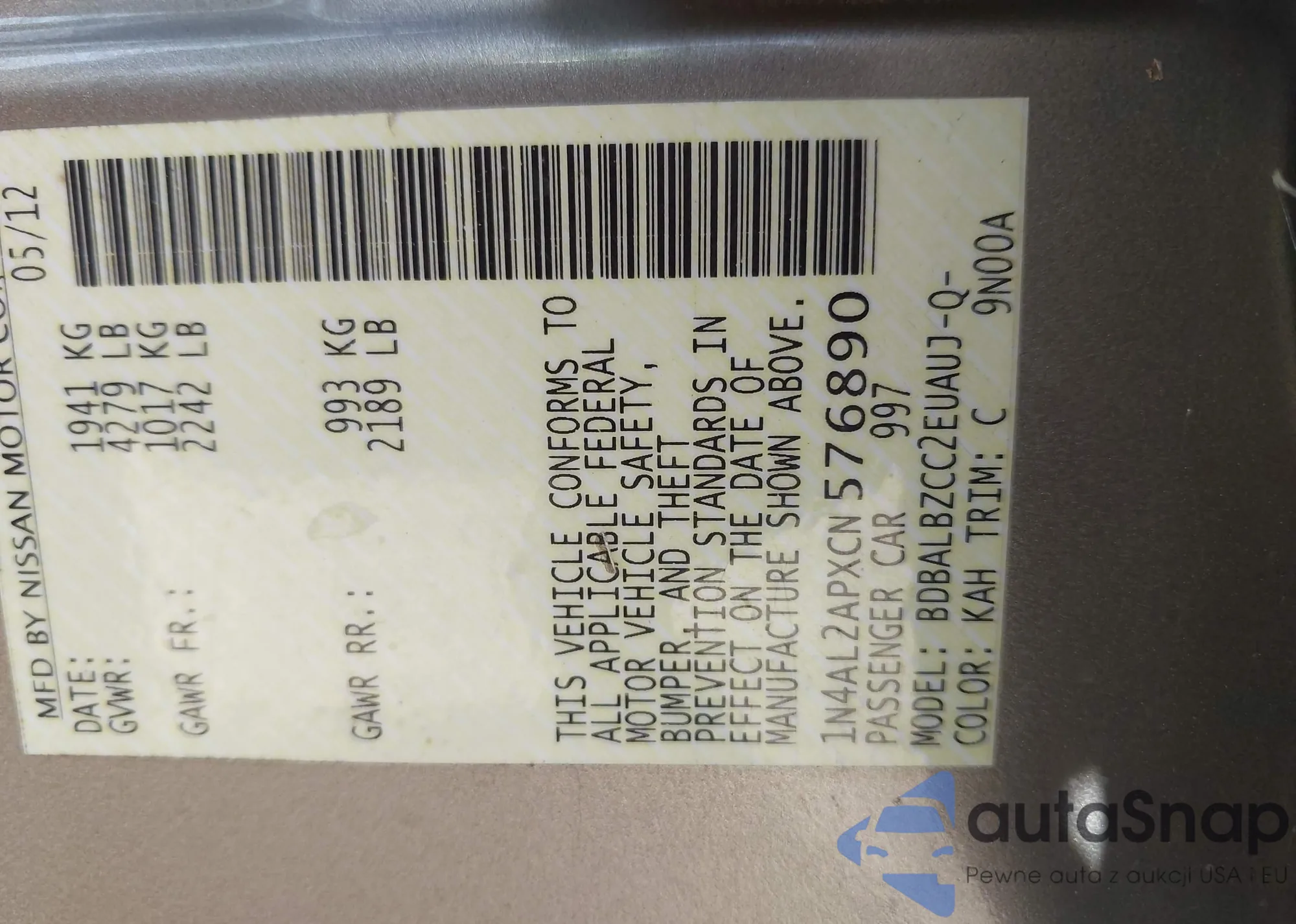• VIN 1N4AL2APXCN576890
