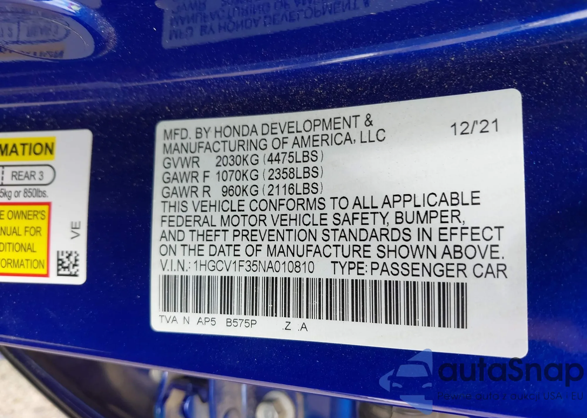 • VIN 1HGCV1F35NA010810