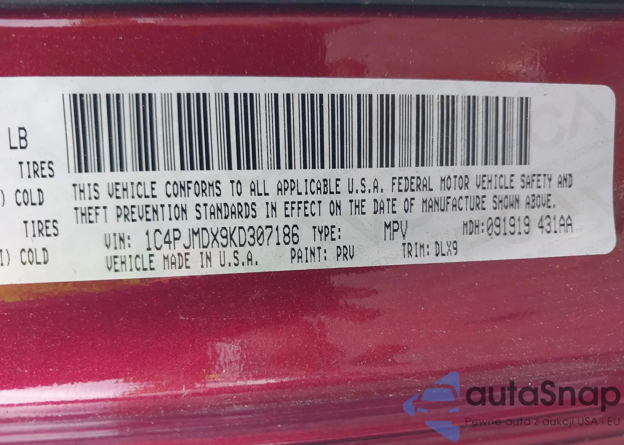 LOT: 42706441 VIN: 1C4PJMDX9KD307186