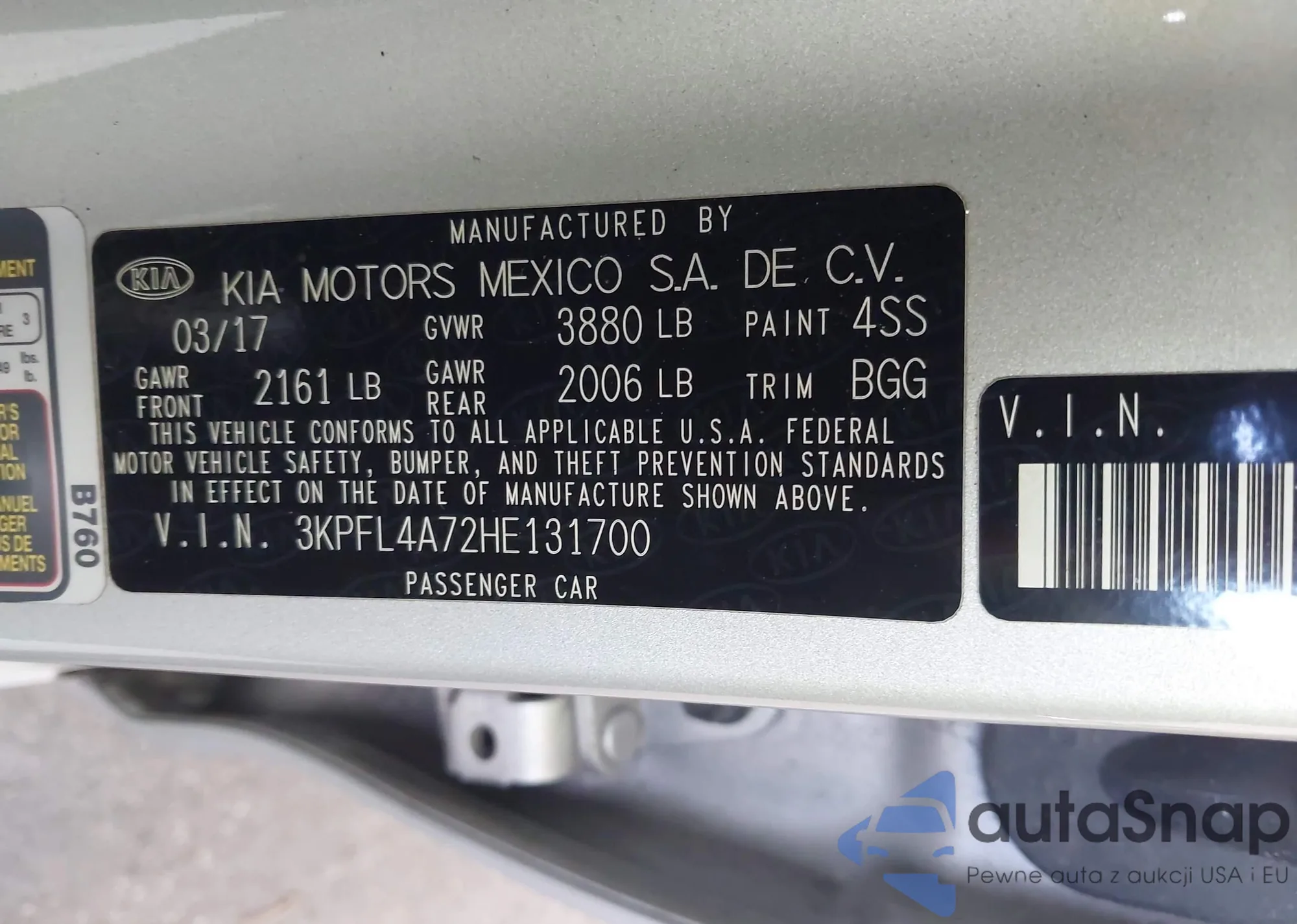 LOT: 42578062 VIN: WBA8B7G37HNU38211