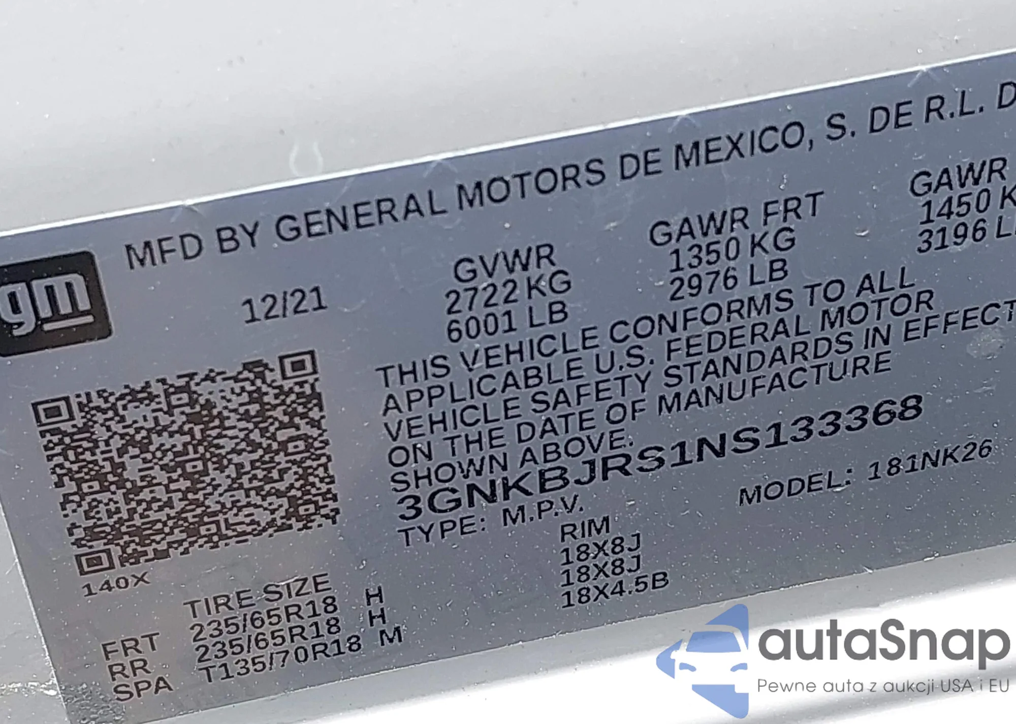 LOT: 42696922 VIN: 3GNKBJRS1NS133368