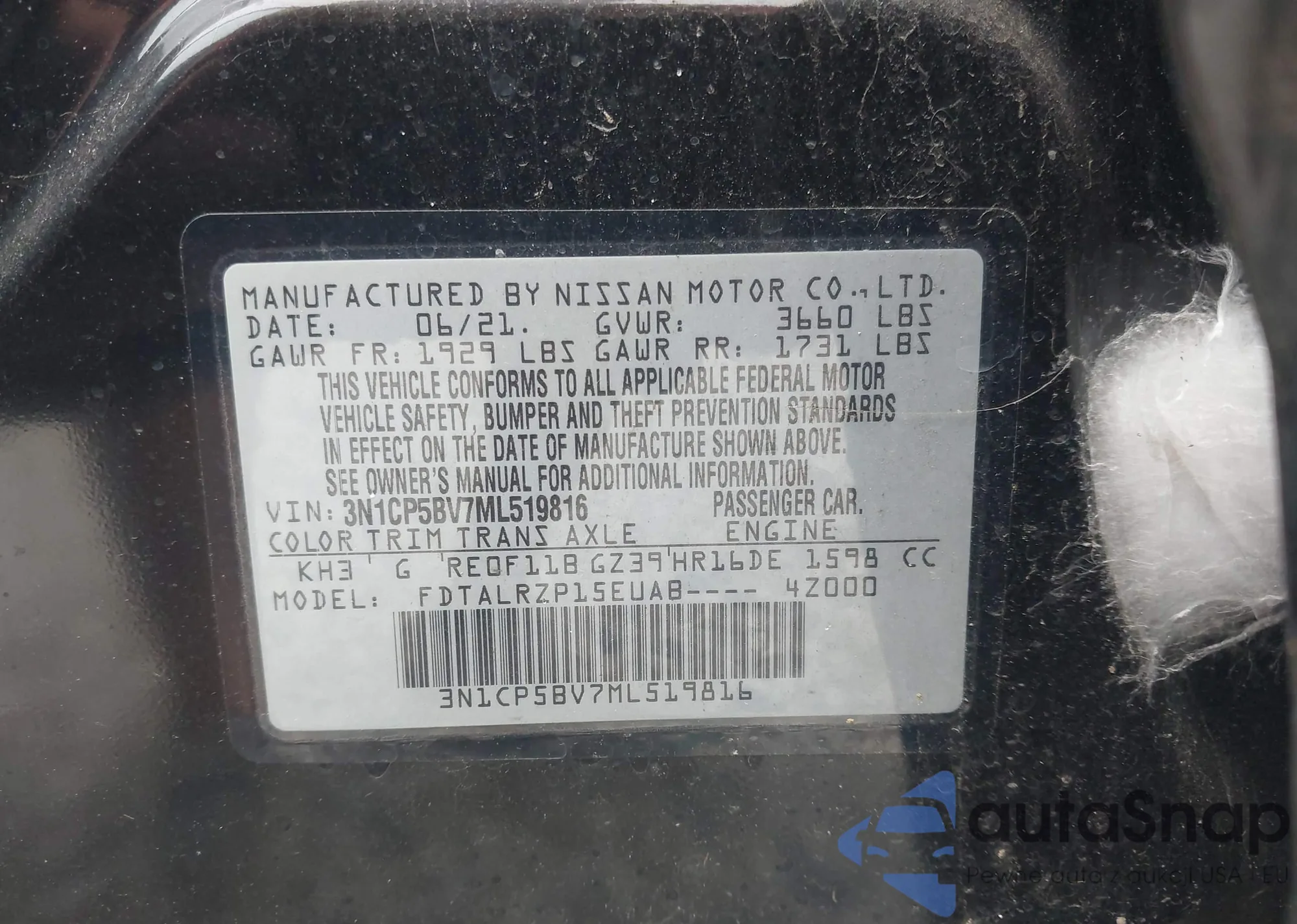 LOT: 42758983 VIN: 3N1CP5BV7ML519816