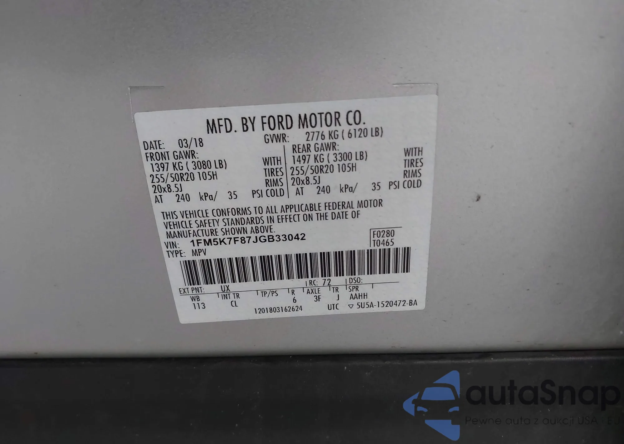 LOT: 42913866 VIN: 1FM5K7F87JGB33042